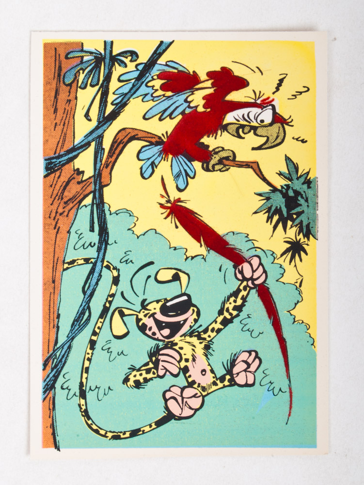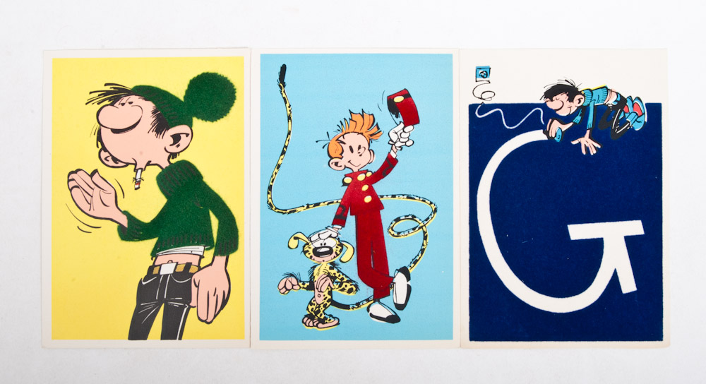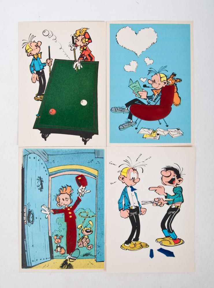ca. 1965. Cards with felt on which Guust, Robbedoes and Kwabbernoot and the Marsipulami are depicted. In very good condition. (total 12)