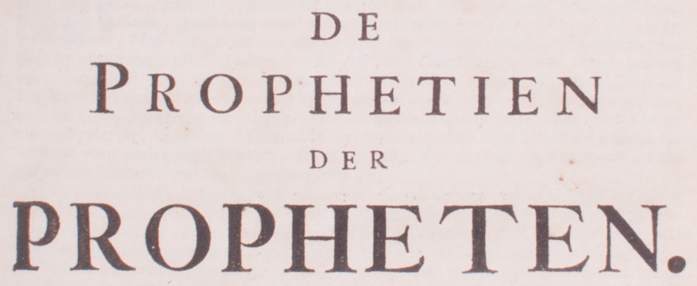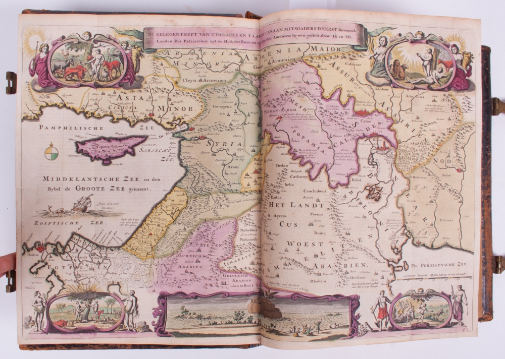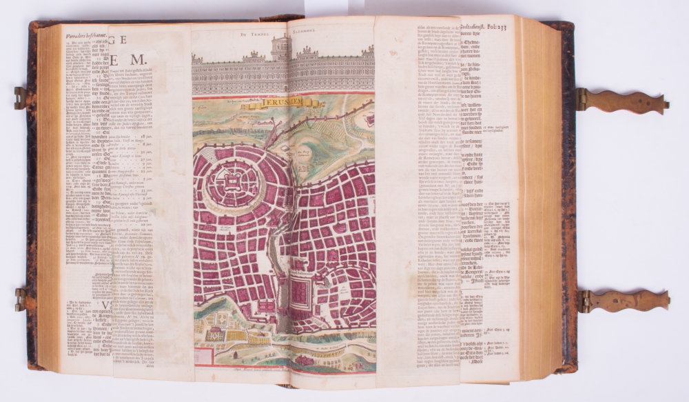 vervattende alle de Canonijcke Boecken des Ouden en des Nieuwen Testaments. Dordrecht, H. en J. Keur/ Amsterdam, M. Doornick, 1690, 4 parts in one vol., (24),332; (2),144; (14),169; (2),58 pages, with engr. title page, 5 antique hand-coloured engraved maps (incl. world map) and 1 antique hand-coloured map, 19th-cy blindtooled leather over wood casings, with 2 copper clasps and each casing with 5 copper buttons, folio.
