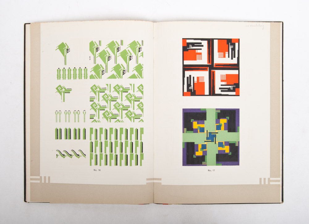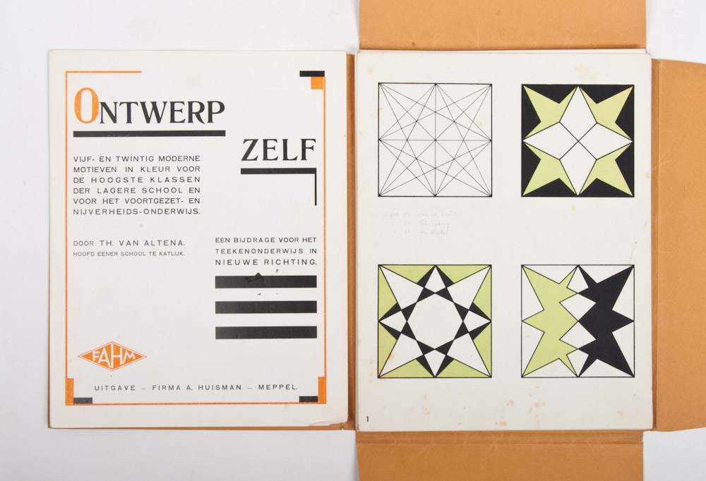 Ontwerp zelf. Th. van Altena, 2nd ed., A. Huisman, Meppel, ca. 1925. 25 Moderne motieven in kleur voor de hoogste klassen der lagere school (..), including explanatory sheet in original folder + Zelf Ontwerpen van vlakversieringen. Talens & Zoon N.V., Apeldoorn, ca. 1935. Tek. G. J. van Lerven, tekst C. Bakhuizen van den Brink-Ozinga. 4to. - and 2 others.