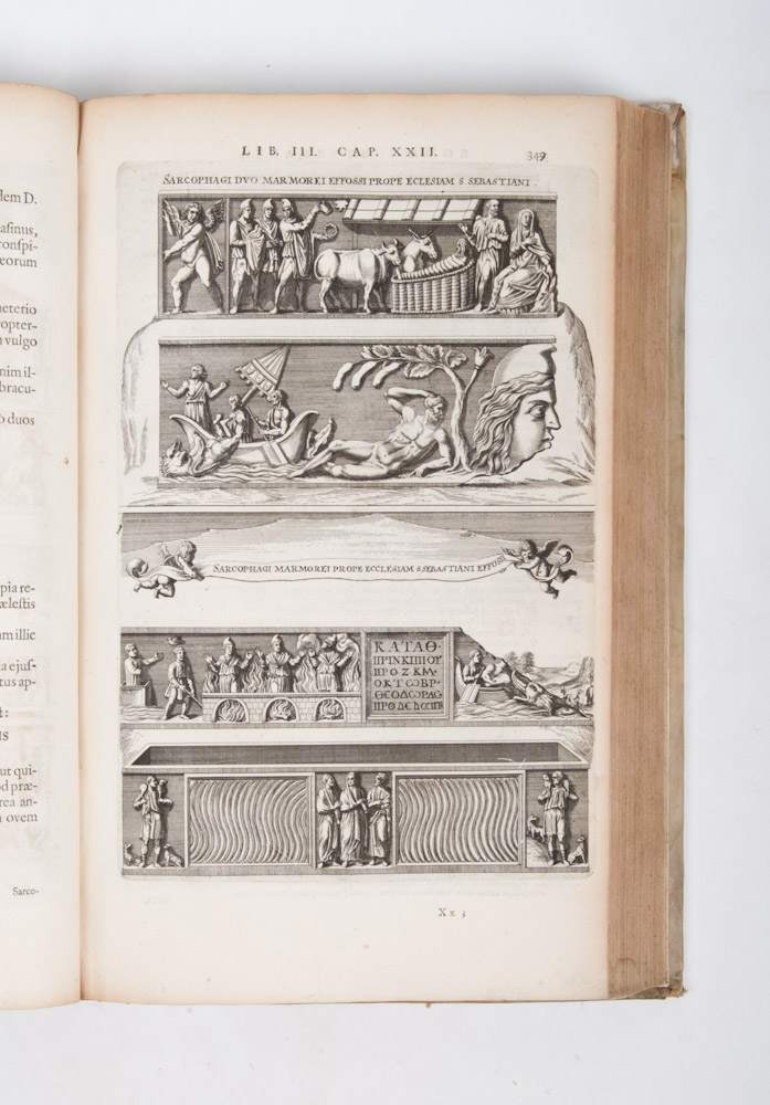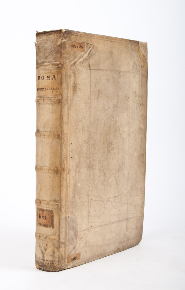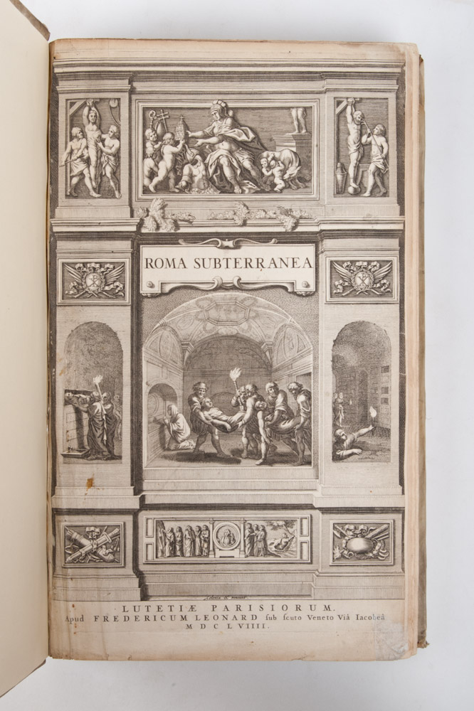 Folio, vellum, 2 parts in one vol., new endpapers, ill. frontispiece, titles with vignette, [8], 352, [24]; [8], 396, [16] pp., folding map of Ancient Rome (cut short), 118 illustrations in copper engraving, 84 of which full-paged and 160 smaller ill. in woodcut. This is the second, extended edition with add. annotations and illustrations by Aringhi and Severano.
