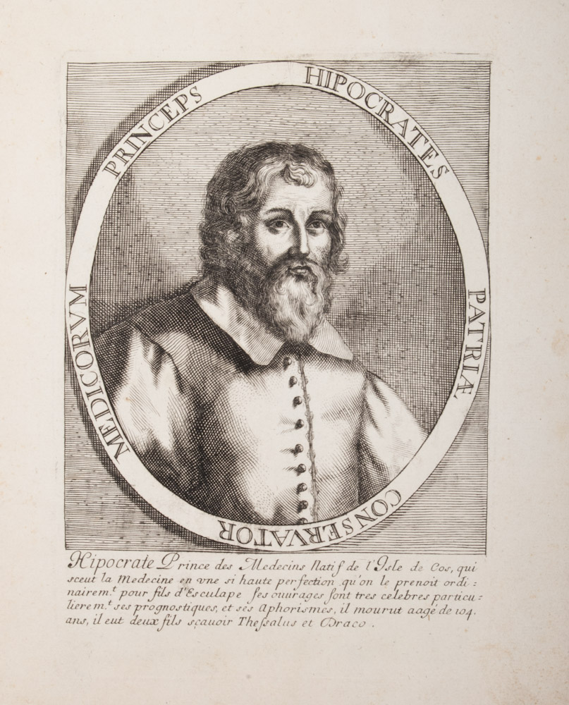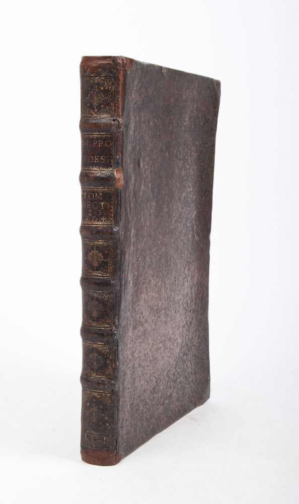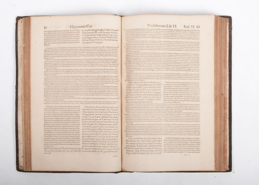 Sm. folio, leather, title with vignette, (18),50,232,158,145,(1) pp., wrong pagination but complete. The first part (of 2) with 4 (of 8) sections, title page reinforced. Greek and Latin text, var. contemporary annotations in hw in ink. The first edition of Anutius Foesius' critical edition of the complete works of Hippocrates was seen as the best translation of its time. Beautifully designed typography of the Greek and Latin text.