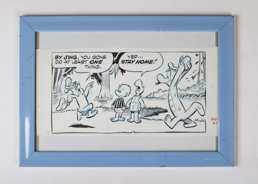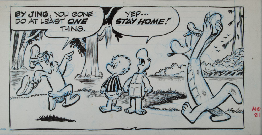 "By Jing, you gone do at least One thing. Yep...stay home!" Original drawing in Indian ink with blue spot colour. Panel depiciting all main characters, including Pogo Possum. 24.5 x 13 cm.