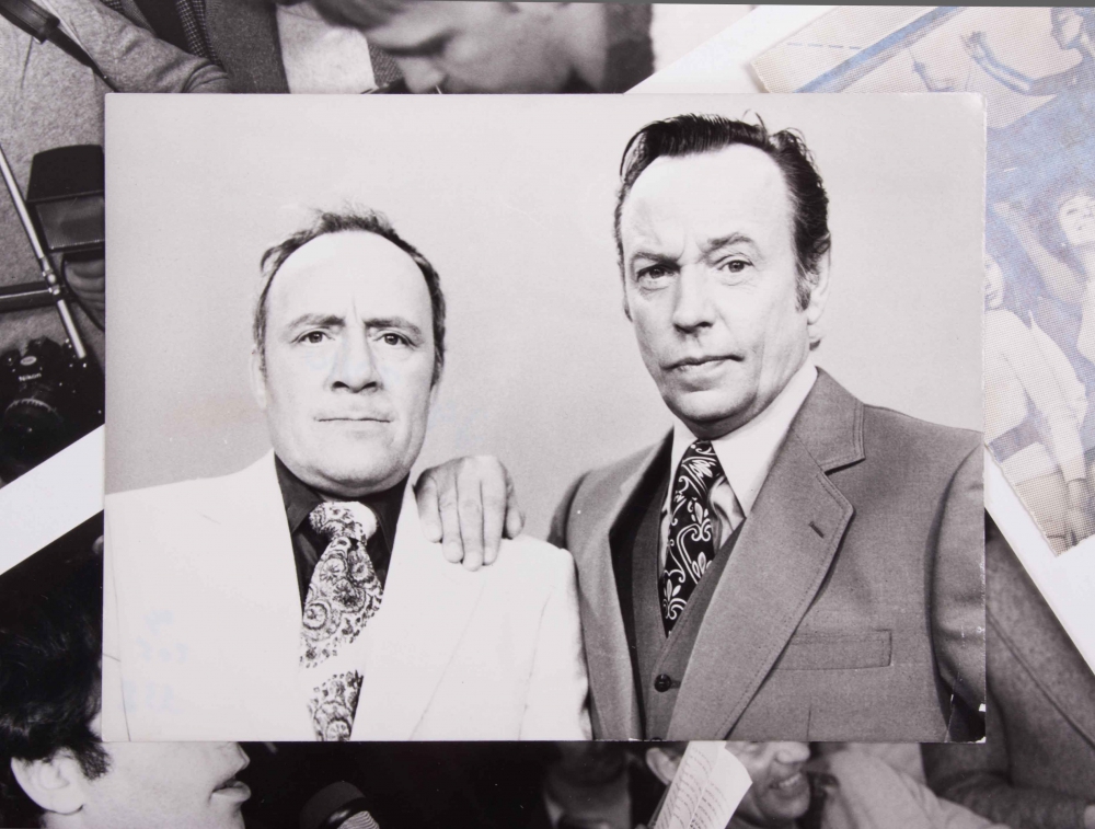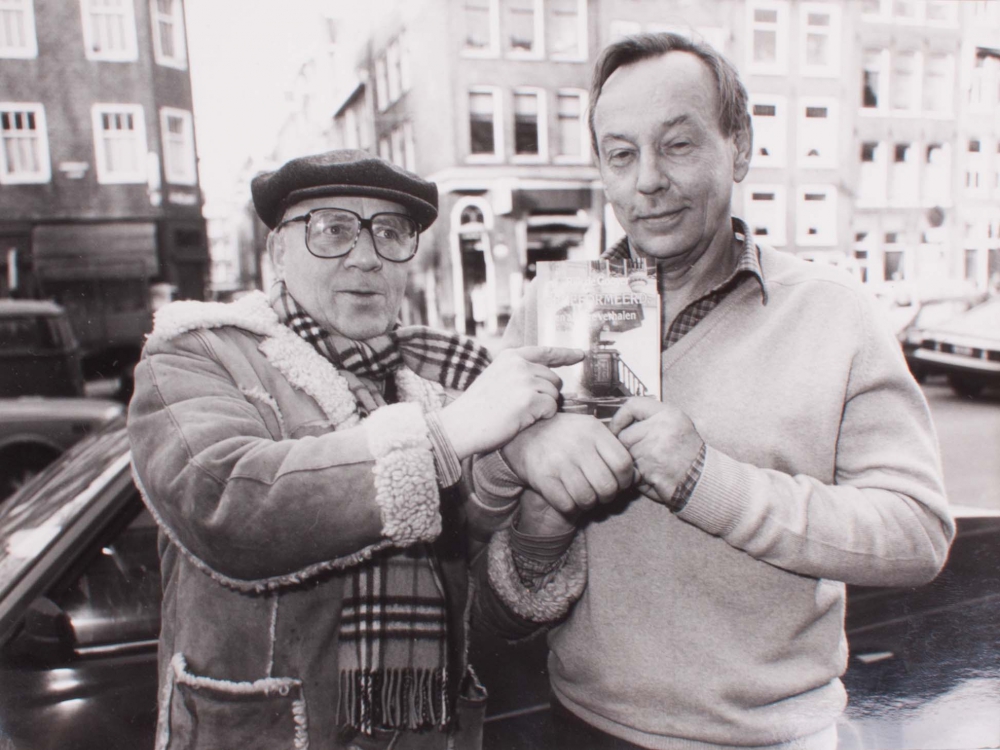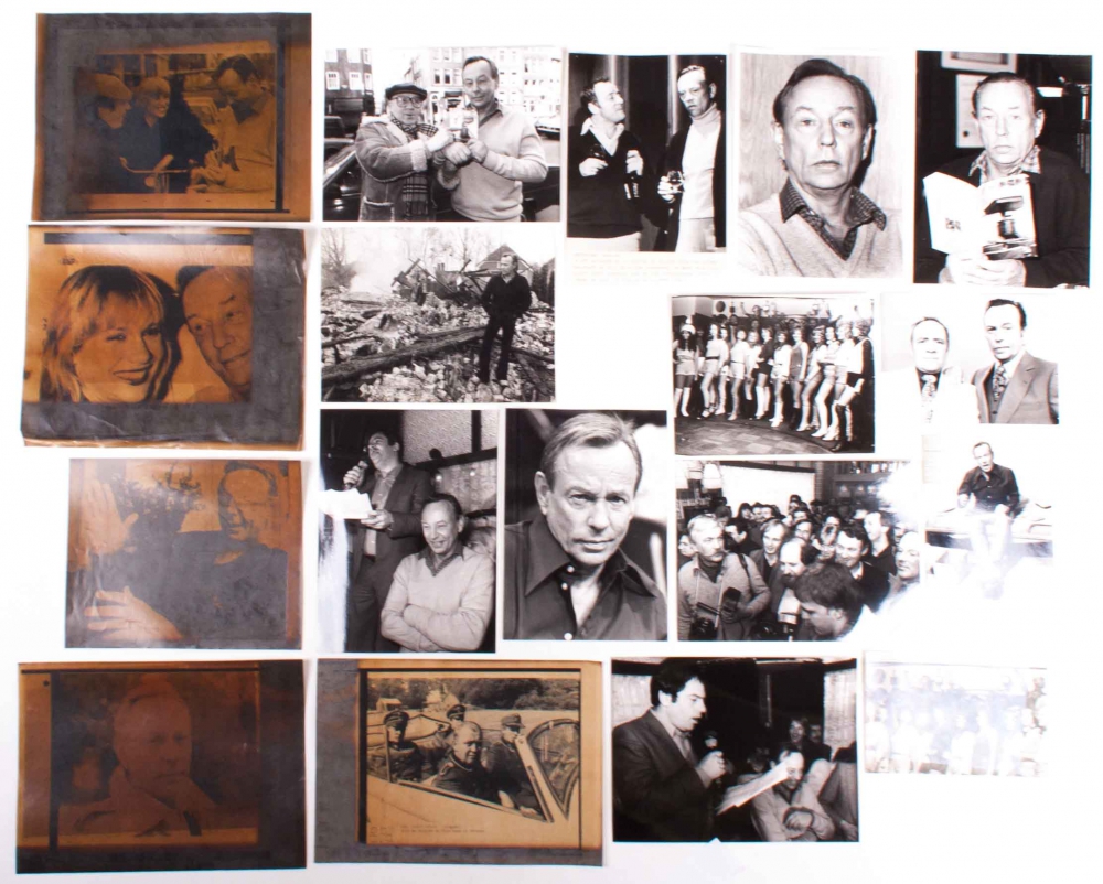 Nice archive with beautiful press photos, largely copyright Ger Dijkstra en Zoon on the back side. Incl. Rijk de Gooier as Piet Bakker (1979), as detective (1979), with Henk Meier, with John Kraaijkamp (Johnny en Rijk Show, 1968), with Ischa Meijer, with the named book in his hands (multiple photos), at a Miss Hot-Pants contest (1971, De Gooier was on the jury and is on a photo behind a line of 13 ladies), as SS soldier. Added: 2 cassette tapes containing a large part of the original interview between Meijer and de Gooijer.