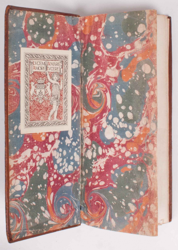 Leather sl. affected by ink corrosion from the speckles. Very good copy from the library of Baron de Jessé-Levas (Dijon), with his ex libris with motto "Lucem Amare Amore Lucere" on inside front cover.