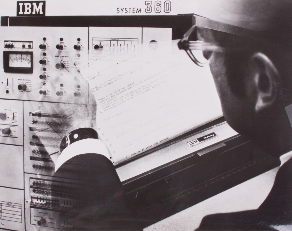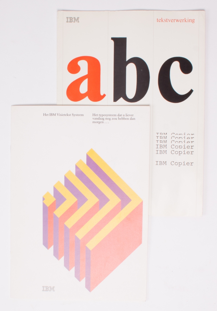 Lot with 14 IBM flyers and manuals, including "Een vergelijkende studie van handbewegingen bij het typen, Het IBM AS/400 Communicatie netwerk systeem, het Call-As system (1976) and so on + 7 unfolding magazines (6 pp. each) including the IBM Visietekst Systeem - and 6 original promotional photos for IBM from the '60s-'70s.