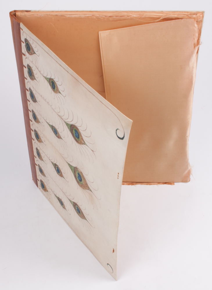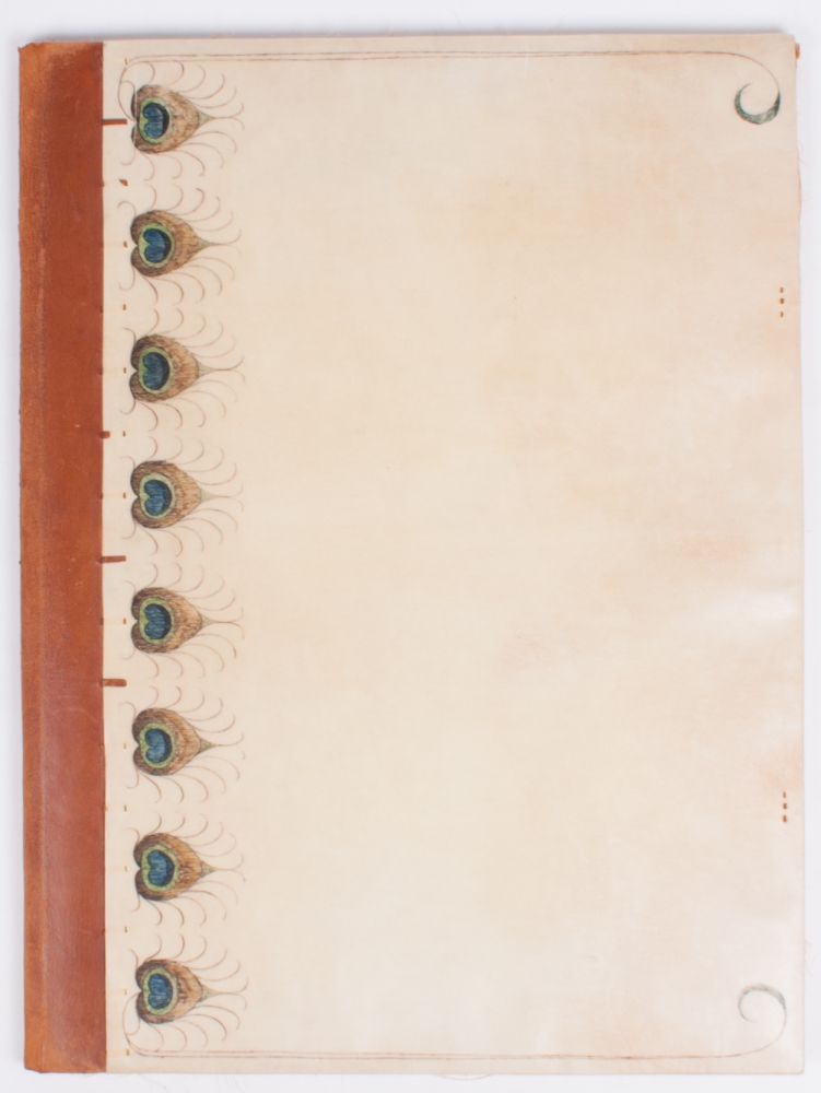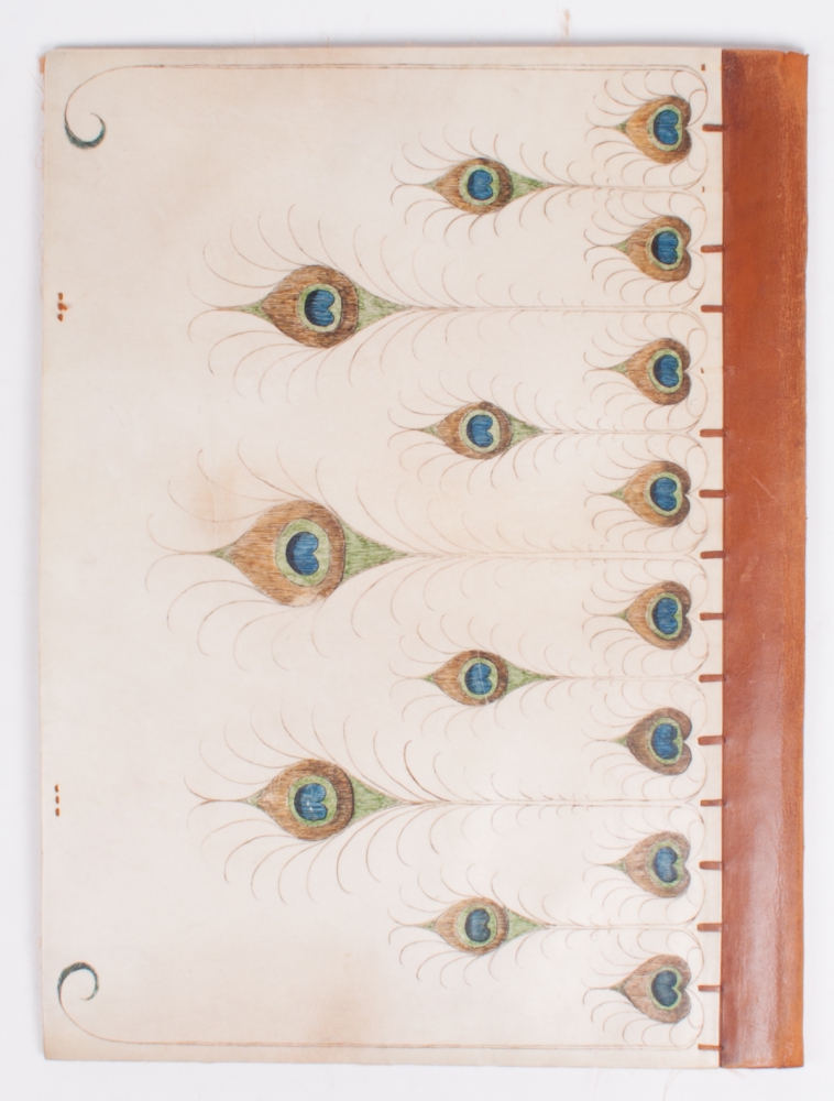 Folio folder in parchment with drawn peacock feathers, with calfskin spine. Side light brown inside. 52 x 39 cm. Unsigned. Ca. 1915.