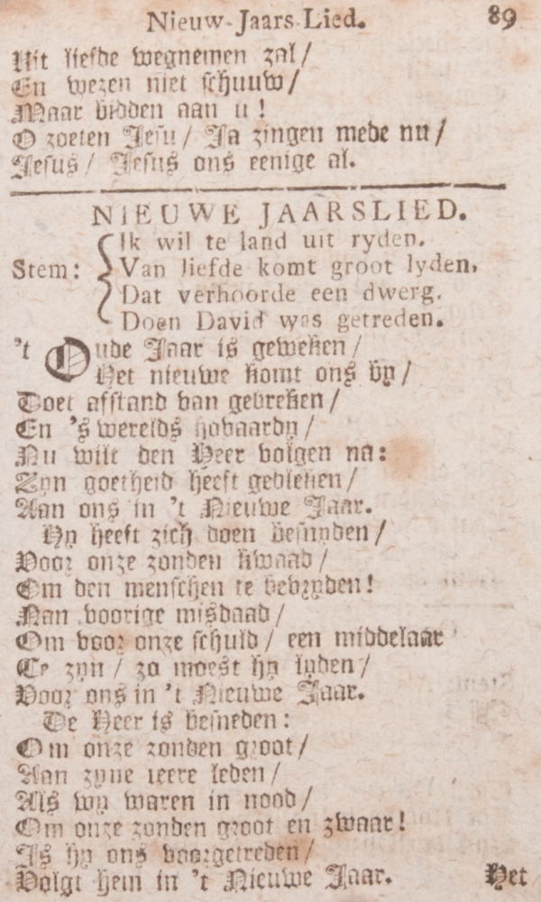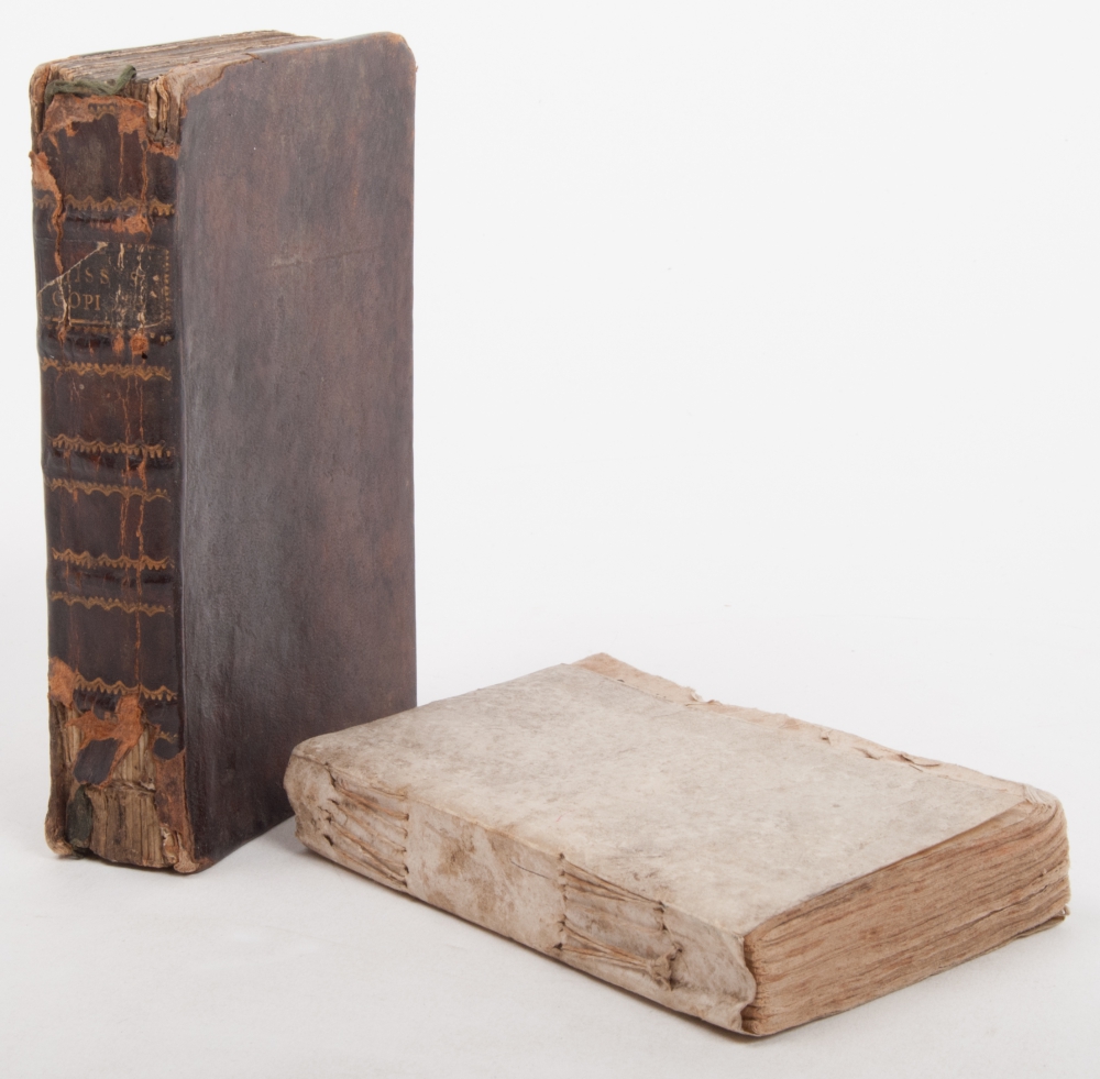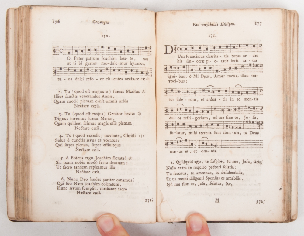 16mo., parchment cover, string-bound, title with vignette, 312 p., signs of use, complete and good. Combined with: Messis Copiosa, dat is Overvloedige Oogst der Geestelyke Gezangen (..) verdeelt in 6 deeltjes, O.A.M.D.G., Amsteldam, T. Crajenschot, 1761. 12mo., leather, ill. frontispiece, title with vignette, 292 p. with bookmark and register, binding dam., inside complete and good. Two rarely seen songbooks for use in the Roman Catholic Church. (total 2)