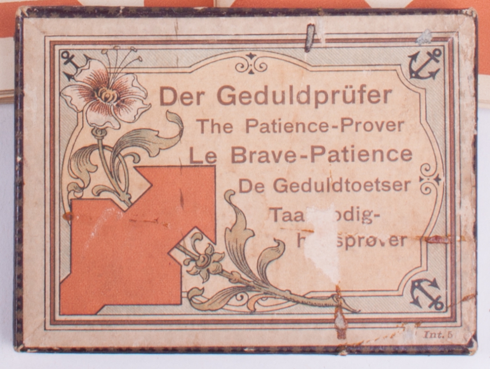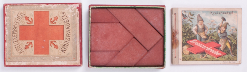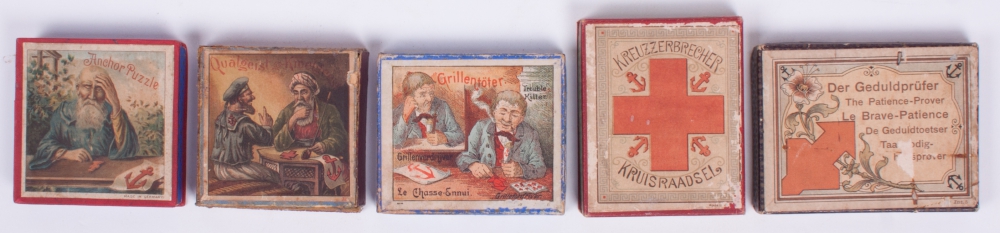 Anchor puzzle, Anker, ca. 1890. Stone puzzle, in original lithographed box with booklet. 8 x 8 cm. + Quelgeist & Kroelgeest, Anker, (idem) + Grilletöter/Grillenverdrijver, Rotterdam, Richter's Boekhandel, box with stone puzzle, including booklet + 2 others.