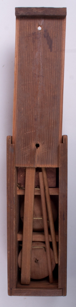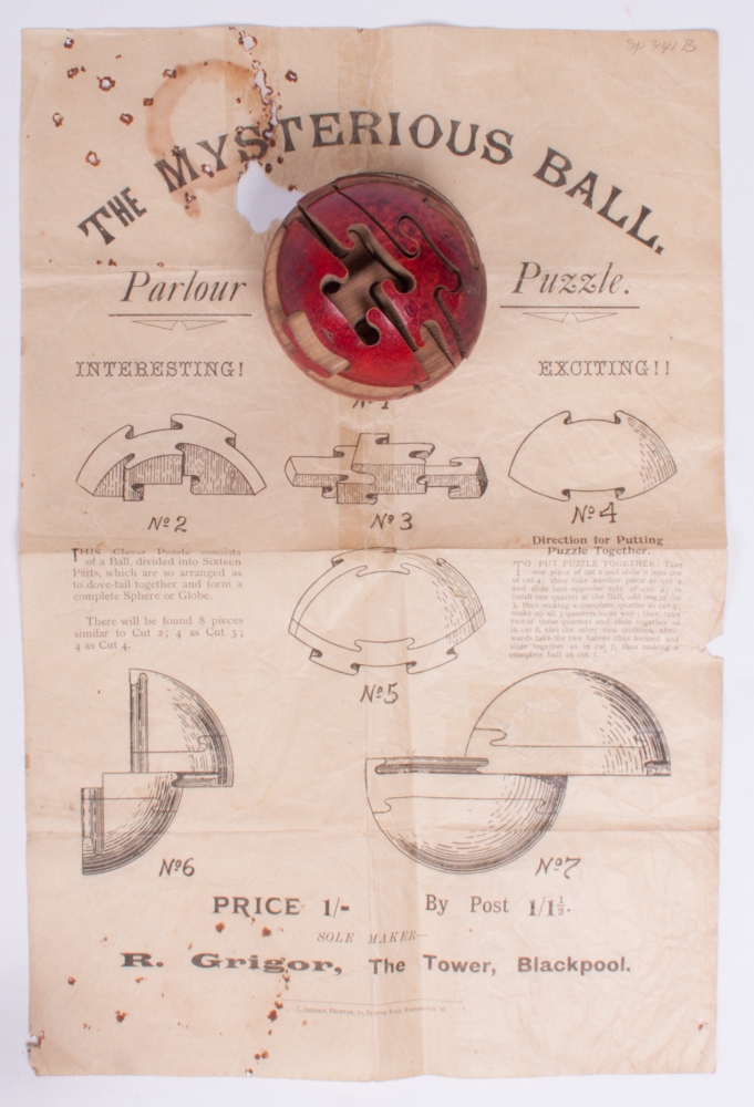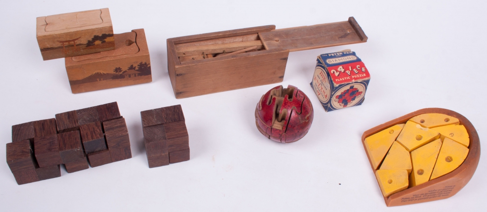 8 Wooden puzzles, mindbenders, ca. 1925-60. Incl. Kaas, Diamond Plastic Puzzle, Indiase Puzzel (2 pieces missing) and tables and chairs.