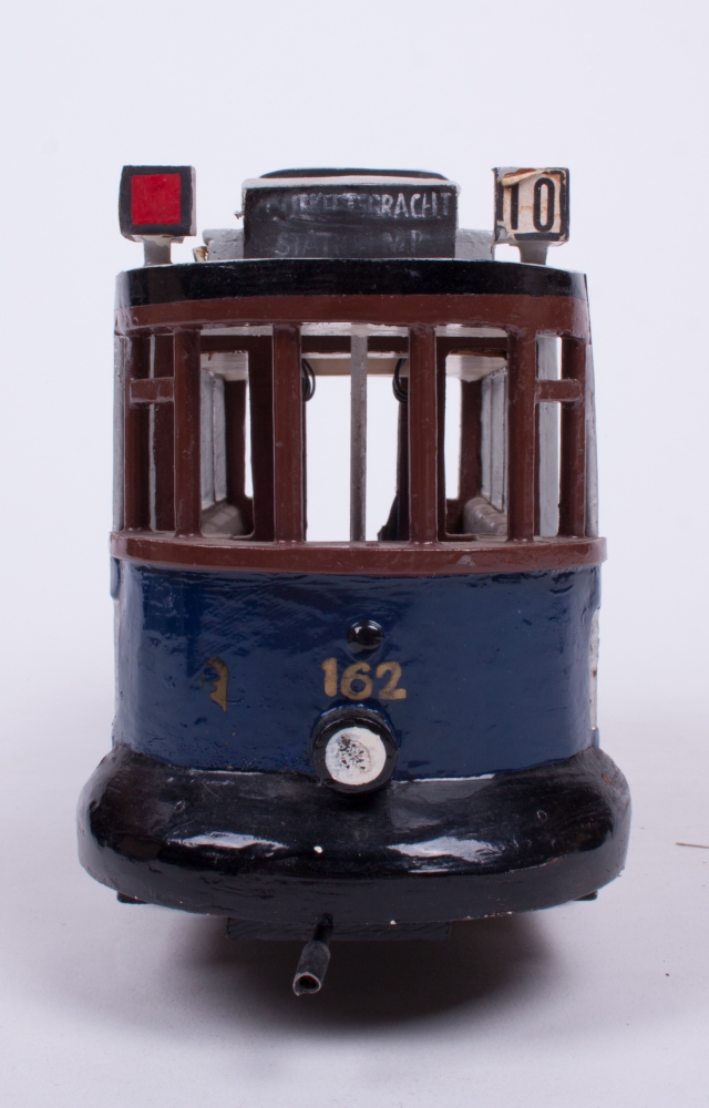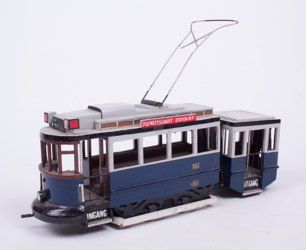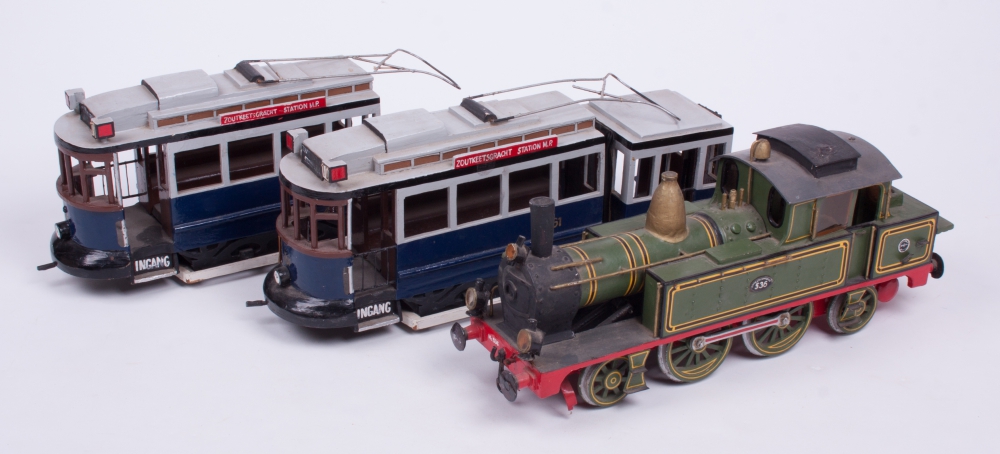 Ca 1970. Handmade and painted train and tram in Amsterdam, souvenir gifted to bookseller Jan Wienema. Tram inscription "Zoutkeetsgracht Station M.P." + 1 other identical tram and connecting piece. Engine partially metal. Length of engine 41 cm.