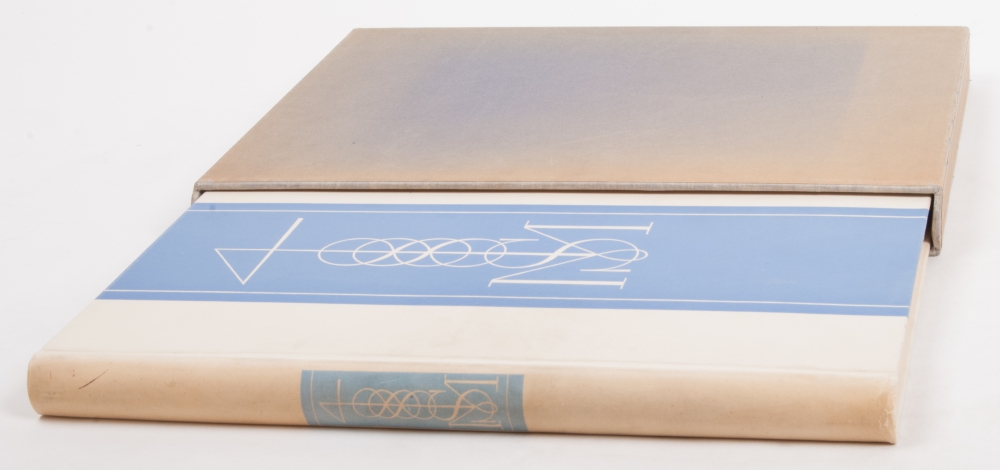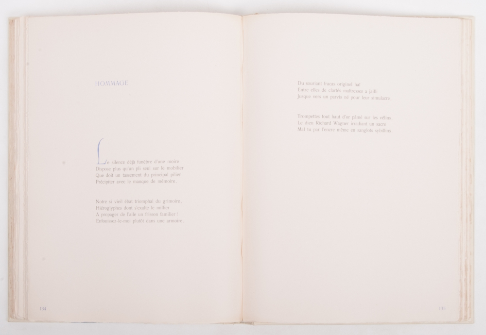 Luxury copy in hard cardboard cassette, folio, calfsleather, typographical ornamentation on spine and plates. Issue nr. 75, issue 88, on paper vélin de Vidalon, spine and slipcase projecting. Beautiful typographical layout.