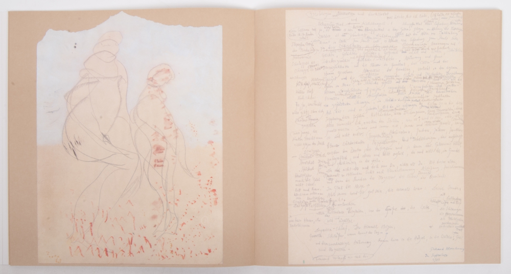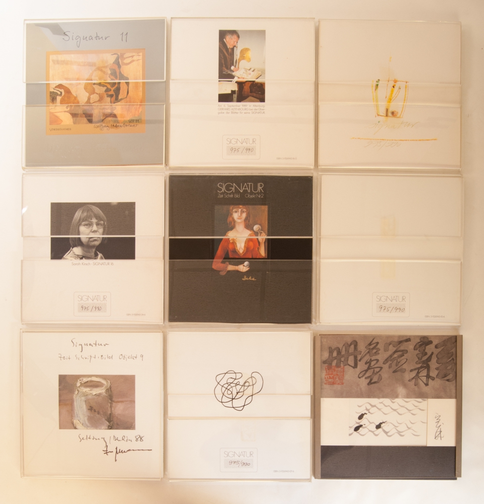 A one-off project with painters producing poetry and poets producing paintings. No. 2 Bele Bachem, 7. Christoph Meckel. 8. Claude Simon. 9. Klaus Fussmann. 10. Bernard Schultze. 11. Wolfgang Hildesheimer. 13.Gerhard Altenbourg. 15. Jiang Baolin and 16. Sarah Kirsch. Verlag Theo Rommerskirchen, 1985-1992. Printed in a limited edition of 990 copies, this is no. 975. All issues are individually signed by the artist; paper covers in plastic holder (ca. 30x30 cm.)