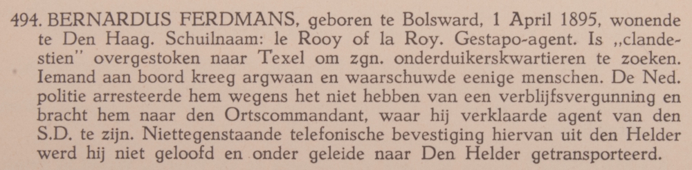 Special document, published underground. Descriptions such as "BRACHT, wonende Haarlem, Junoplantsoen 12; pl. m. 20 jaar oud. Noemt zich ook wel Pierre. Klein van postuur, zwart haar. Doet zich goed voor maar is zeer gevaarlijk. Gestapo-agent" or "Hendrik Marie E. Vughts, geboren 25-4-'96. Staalhandelaar, Rotterdam, Beatrijsstraat 30a. Klein formaat. Brengt onderduikers aan."