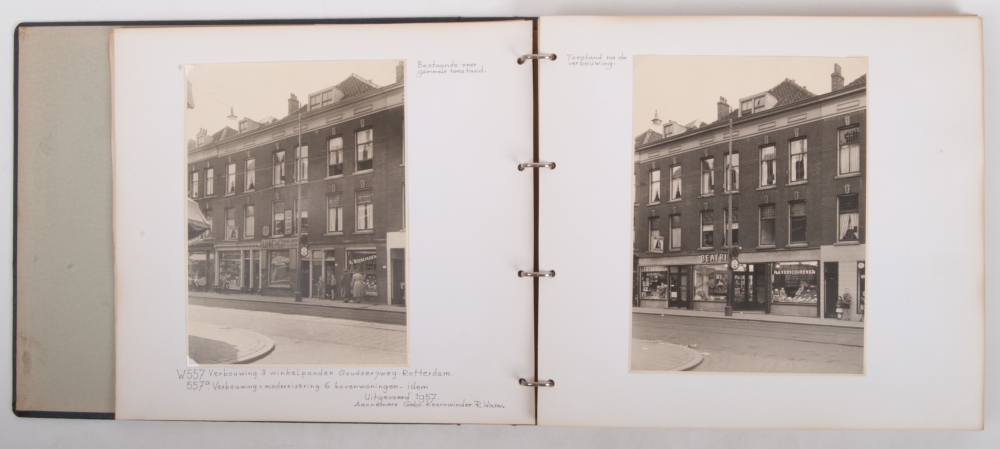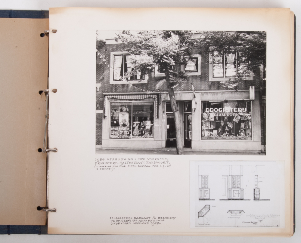 Album with the work of this Delft architect between 1954-1972. 103pp. Largely filled with photos of projects such as storefronts but also larger projects such as Fabriek Nonius in Buitenwatersloot, also newspaper cuttings about the projects and brief accompanying texts. Folio 30x32.5 in ring binder.