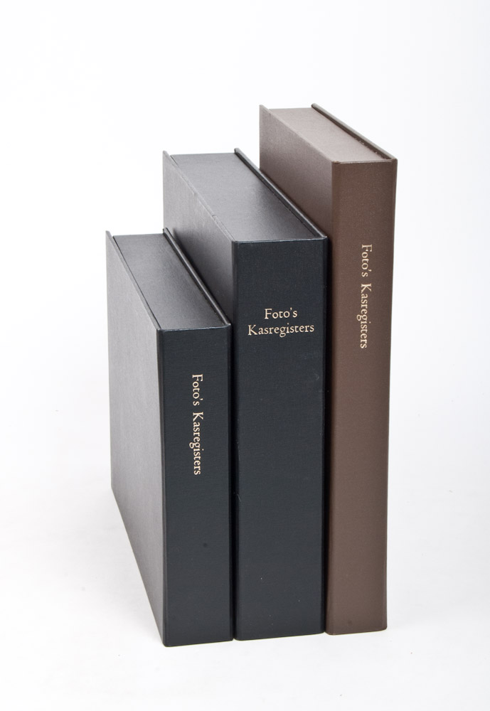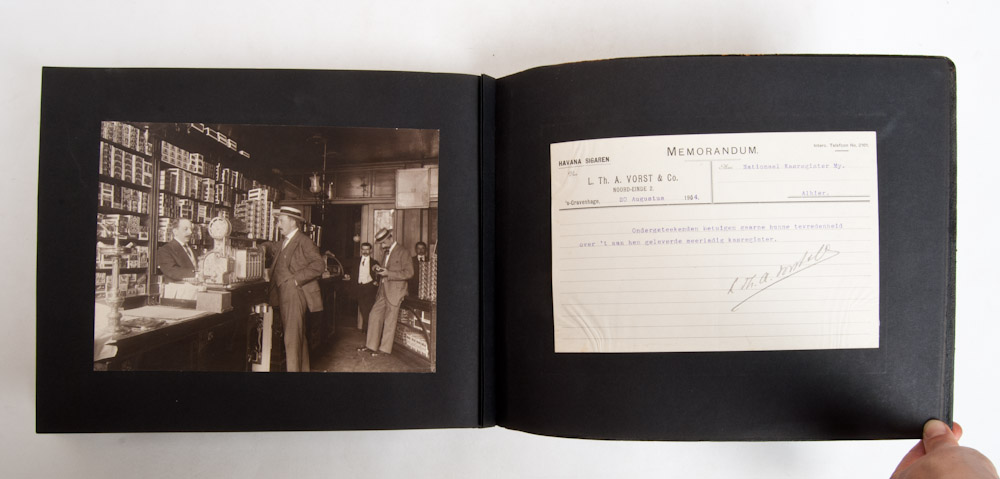 3 albums with photos of cash registers in stores, ca. 1928-1930. Alternating photos of the shopkeeper with a report about his use of the cash registers.