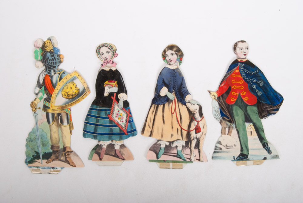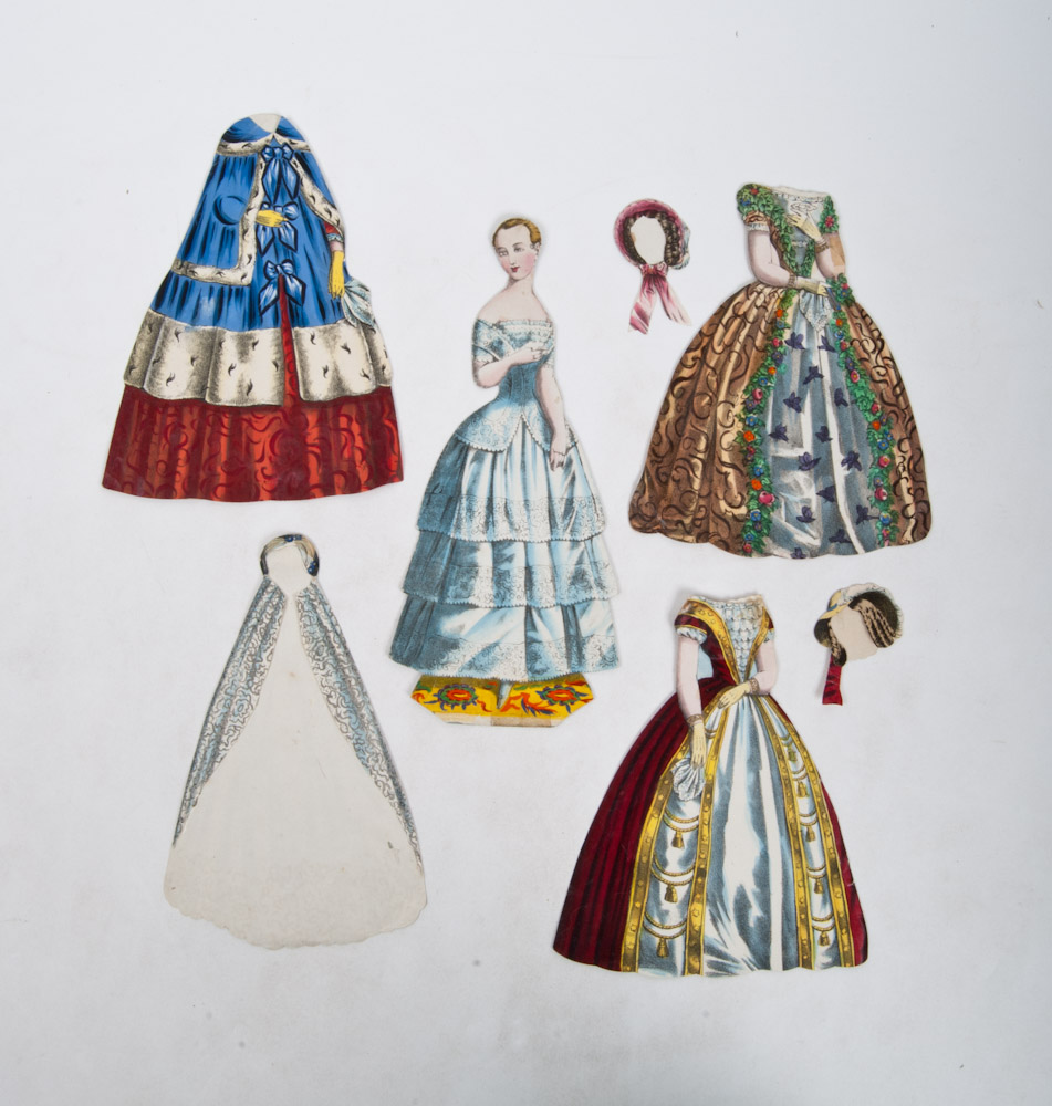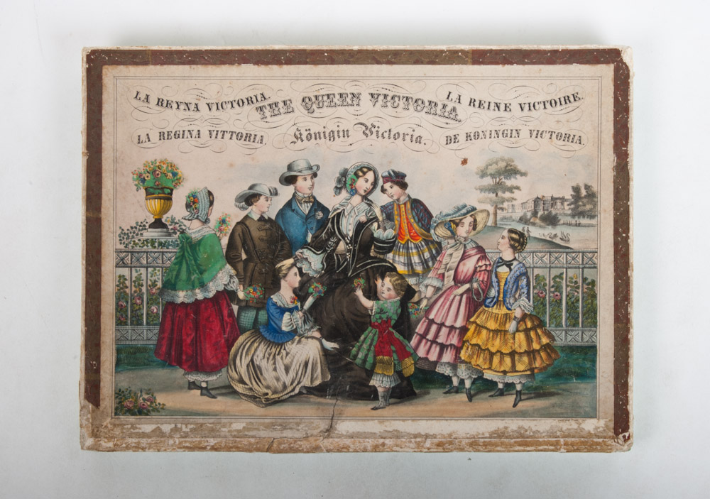 Ca. 1845. Lithographed game in original box with models of Victoria in different sizes. With paper dresses and wigs that can be put on the models.