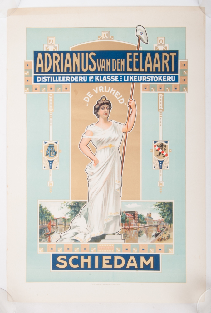 Distilleerderij 1e Klasse: Likeurstokerij "De Vrijheid", Schiedam. Lithograph, ca. 1910. 61.5 x 42 cm.