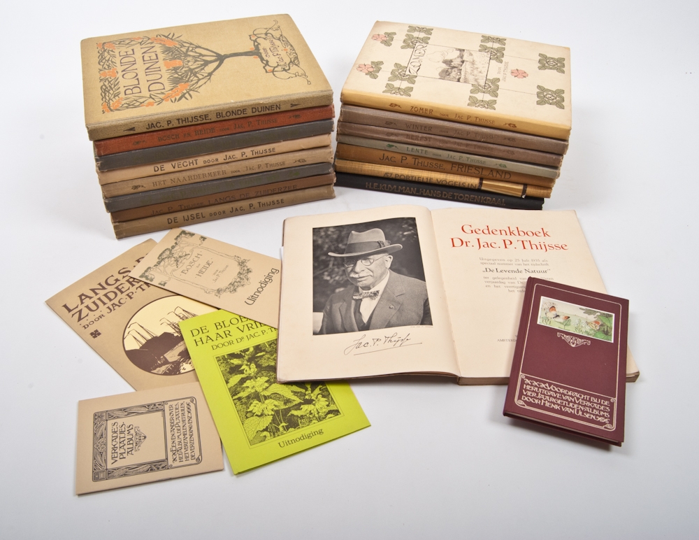 Lot Verkade Albums 1906-1935 with Lente, Zomer, Herfst, Winter, (with inserted pictures), Friesland, and 8 other albums, all prior to 1936. + Several Verkade leaflets, Het Gedenkboek Jac. P. Thijsse and the later published Vogels in Artis, Portielje 1988.
