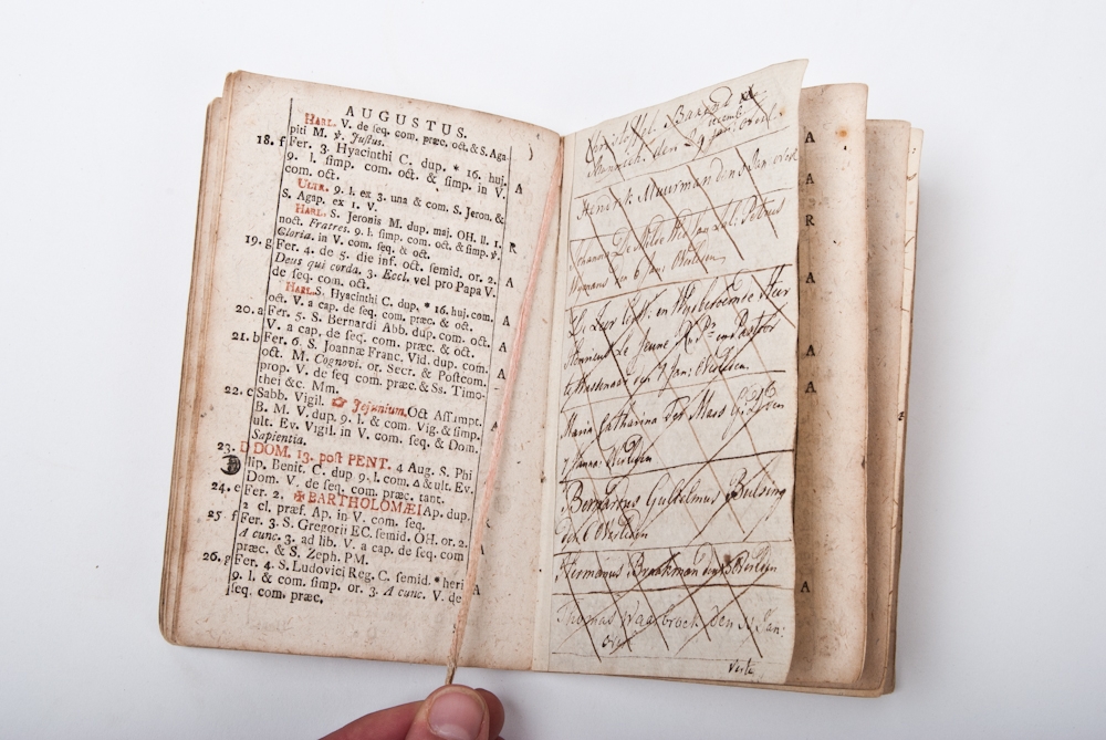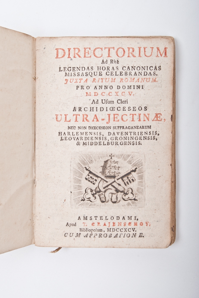 -Nec Non Dioeceseon Suffraganearum Harlemensis, Daventriensis, Leovardiensis, Groningensis, & Middelburgensis. Amst., T. Crajenschot, 1795, (72) p., printed in red and black, engr. title vignette, several small woodcuts, simple cardboard binding with buckram spine.