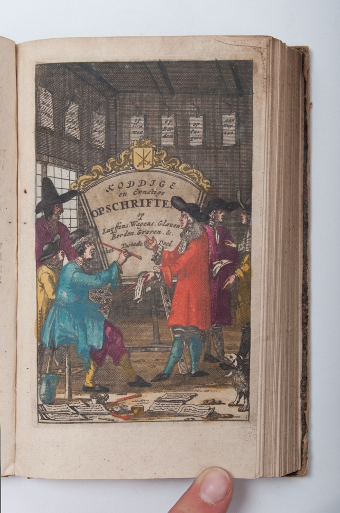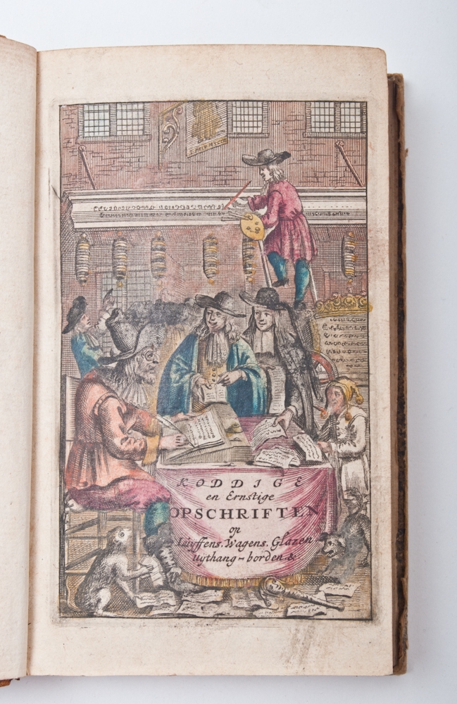 -op Luyffens, Wagens, Glazen, Uithangborden, en andere Taferelen. T'Amsterdam, Jeroen Jeroense, 1698 and 1683, 12mo., half leather, coloured and illustrated frontispice in copper engraving, 160 and 248 p., 2 vols. in one binding, 2nd vol. also has a coloured and illustrated frontispice in copper engraving and 5 other coloured engravings. In good condition.