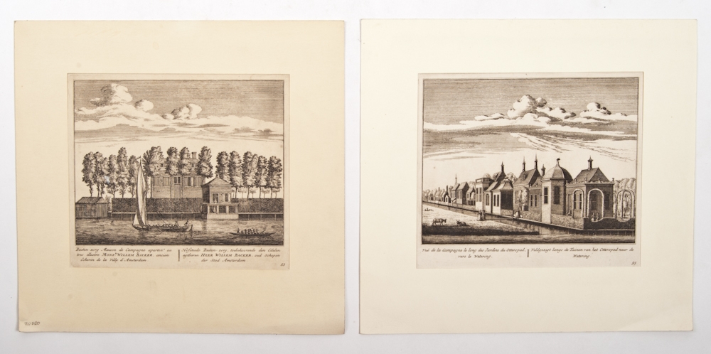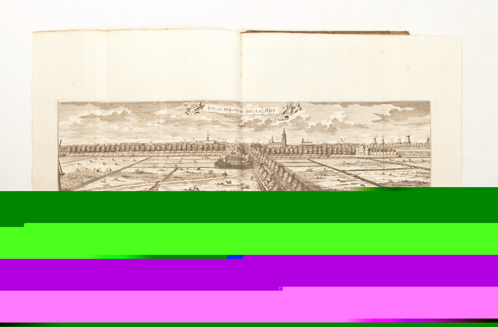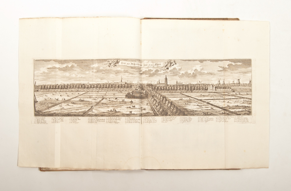 This copy was taken from J.T. Bodel Nijenhuis' collection, with his name and a glued in manuscript leaf with notes on first blank page. The 96 engravings are divided as follows: I. De Amsterdamsche Voorstad de Overtoom, met de Dorpen Amstelveen en Slooten (...) 16 (out of 20) images; IV. De Diemer- of Watergraafs- Meir en het Dorp Diemen 60 images (=complete); V. De Trekvaart van de Stad Amsterdam, tot aan Polanen, of halfwege der Stad Haarlem (...) 14 (out of 30) images; IX. De Stad Oudewater en haare voornaame Gebouwen (...) 5 images (= complete). With large folding print of "Vuë et Perspective de la Haye". The mentioned title print concerns section IV, with "Inhoud der tijtel-print" inserted separately. First 8 leaves waterstained.