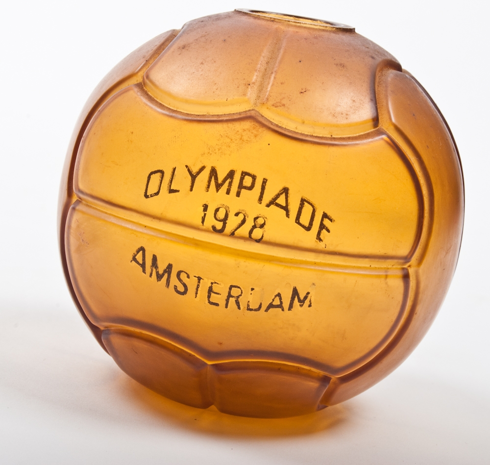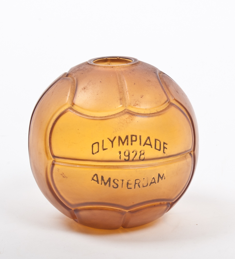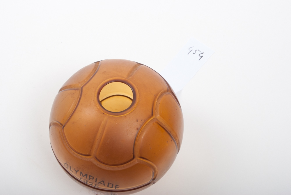 Andries Dirk Copier (1901-1991) Vase in the shape of a football with text: "Olympiade 1928 Amsterdam". Brown glass. Height 11,5 cm.