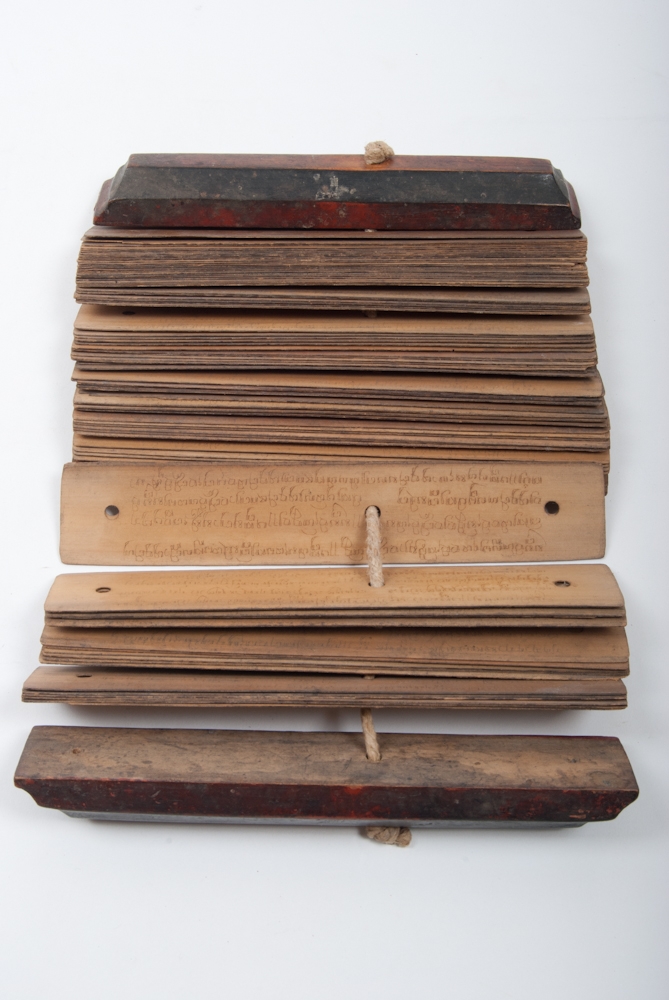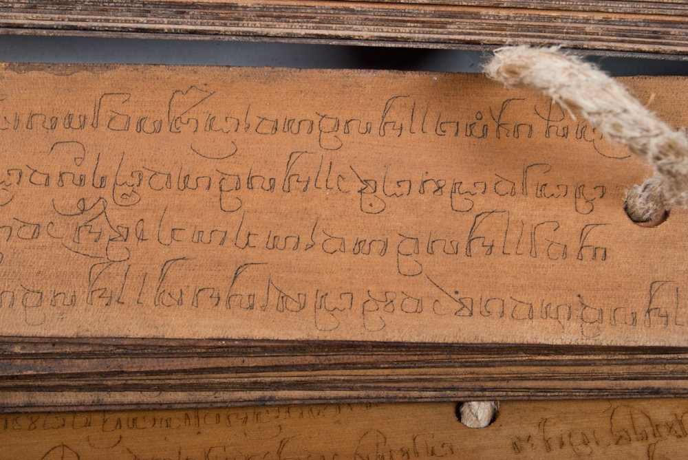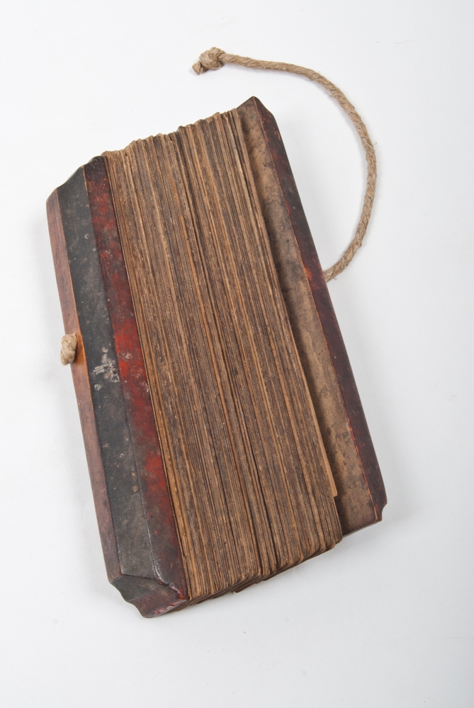 Javanese hand-cut book on Lontar leave (palm leave). Bound with strings, between two wooden blocks. Ca. 1925.