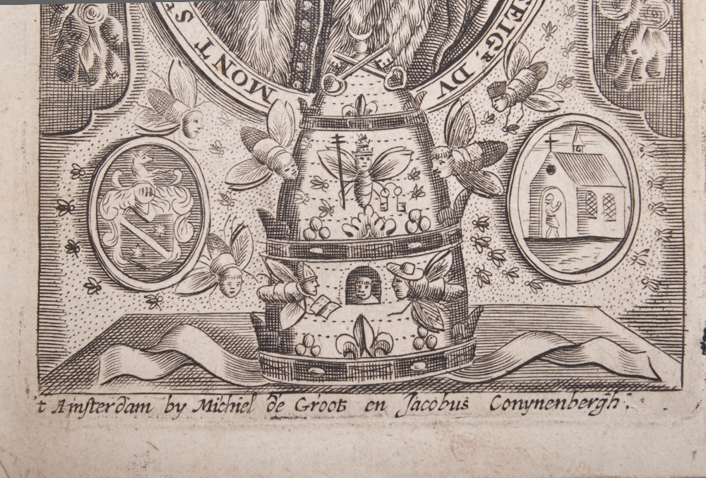 Philips Marnix, heer van St. Aldegonde. Amsterdam, M. de Groot and J. Conijnenberg, ca. 1660. (18), 468 (numbered p. on one side), (18) p. Engr. title-p. with portrait of author and bee hive. In parchment. Sl. loose in binding, otherwise good copy.