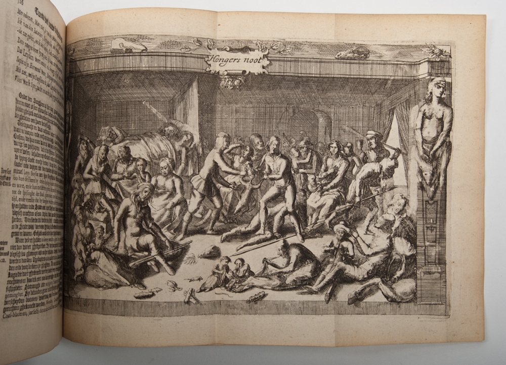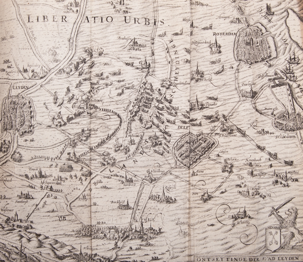 Small 4to. Half leather with marbled sides. With 10 plates in the text, 6 folding prints with a.o. Hongersnoot en Muijterije, 1 map of the Ontsettinge der stad Leyden (small tear and sl. discoloured along extremities) and a folding map of the siege in 1574. Spine restored.
