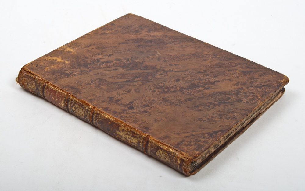 4to. leather binding with marbled endpapers, gilt stamped spine, coloured edges. Complete with 31 copper engravings of maps, views, city plans and medals. Nice copy.