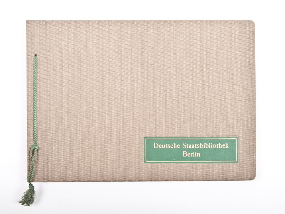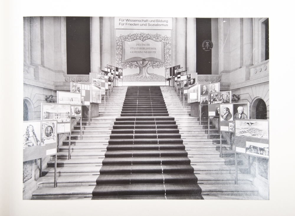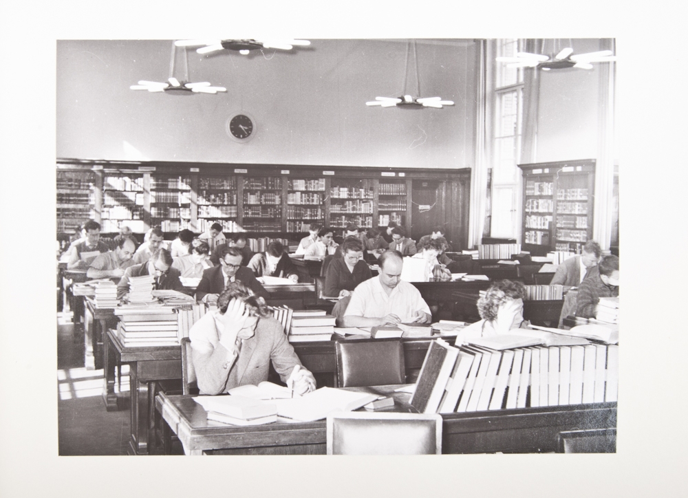 1963, 20 glued in black-and-white photographs of its interior and different exhibitions in the library. Linen binding, bound with strings, folio. Neat copy.