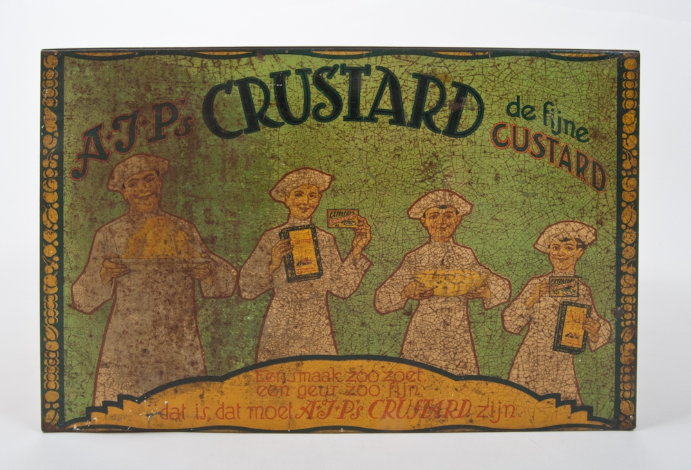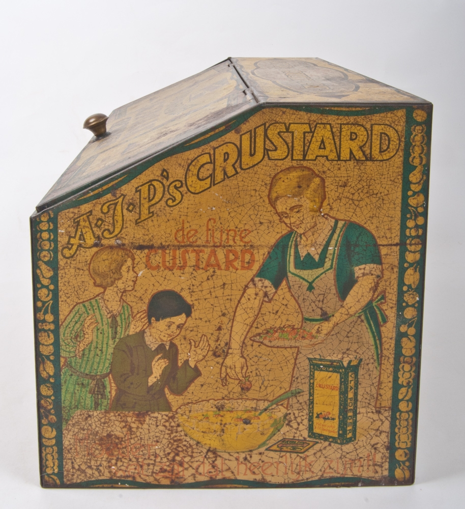 Rectangular can with sloping lid. Ca. 1920. Contains image depicting 4 cooks with pudding. "Een smaak zoo zoet, een geur zoo fijn. Dat is, dat moet A.J.P's Crustard zijn". 30x45,5x28 cm. Sl. worn along sides. Fairly good copy.