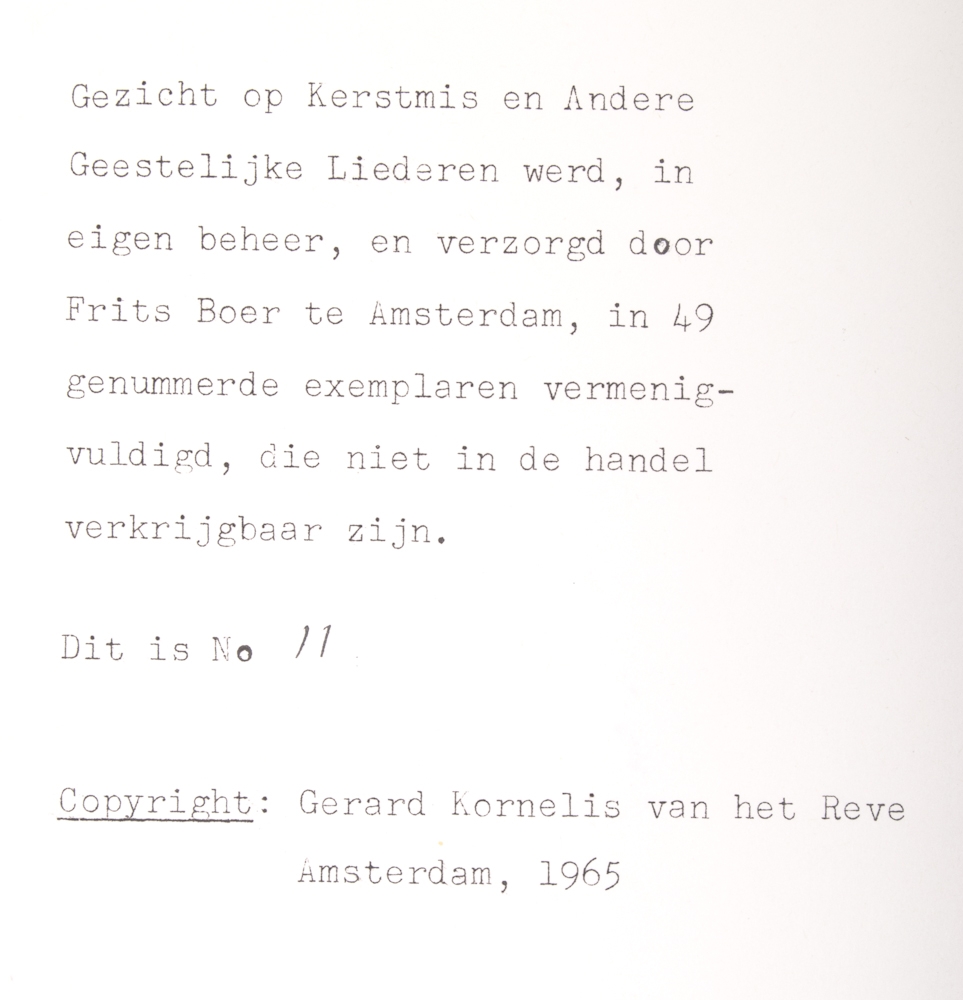 Gezicht op Kerstmis, en andere geestelijke liederen. Amsterdam, 1965. Number 11 out of 49 numbered copies.