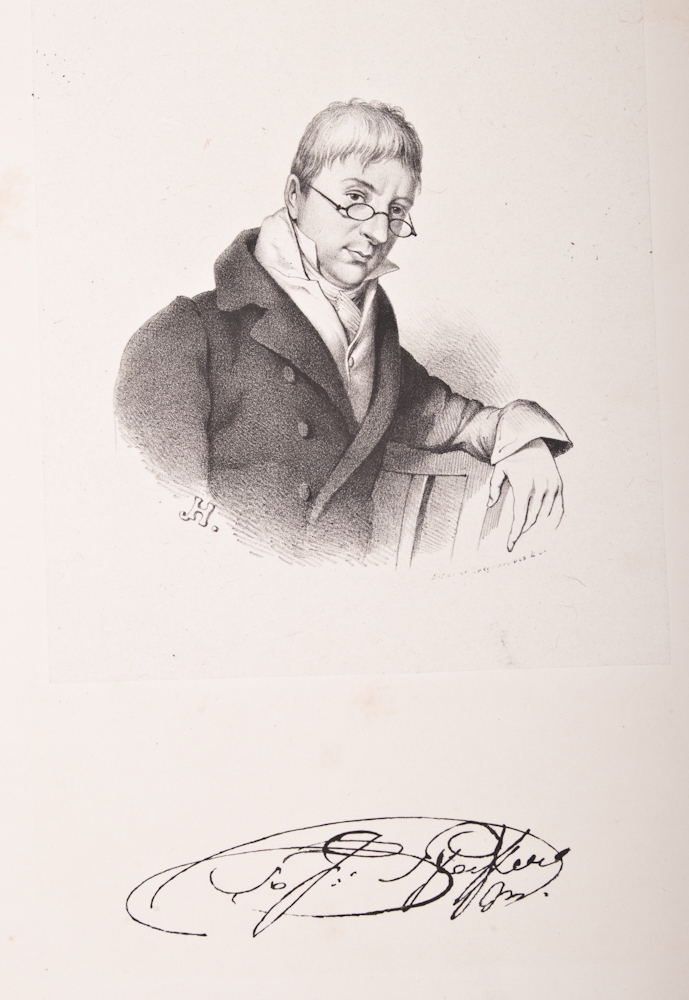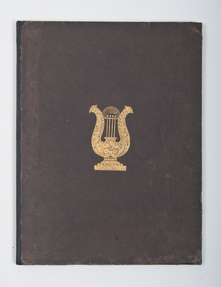 Folio, half linen, gilt stamped front and back cover in the shape of a lyre, complete with a portrait of the author and 8 full-p. lithographs, sl. water damage lower side, illustrations not affected. Rare.