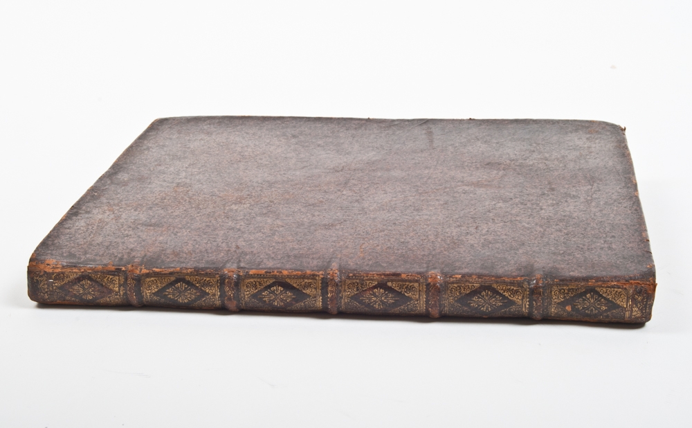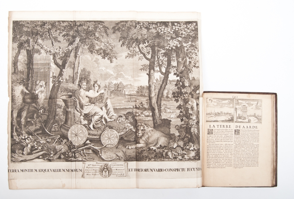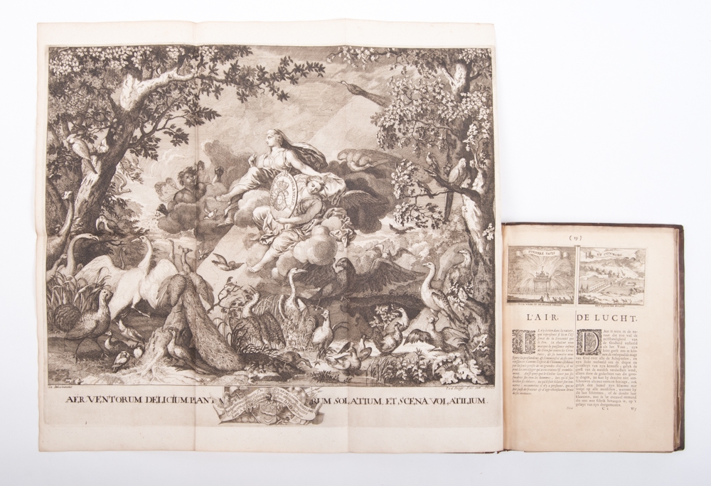 Tapisseries du Roy, ou sont representez les Quatre Elemens, avec les Devises, qui les accompagnent et leur explication, Amsterdam, Pieter van den Berge, ca. 1680. Text in French and Dutch. With engr. title-p., 23 mostly full-p. engravings and 4 folding prints by le Brun. + Suite des Devises Pour les Tapisseries Des Quatre Saisons. Sinspreuken in de Tapyten van de vier Iaartyden Tweede deel. With 1 engr. title-p. and 22 mostly full-p. engravings and 2 (out of 4) folding prints. Two vols. in 1 binding. 4to, leather binding in good condition. (12) 56, (68=vol.2) p.