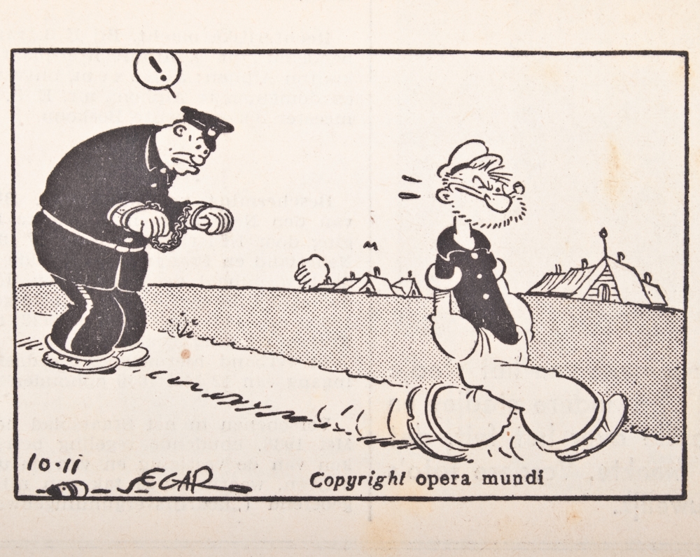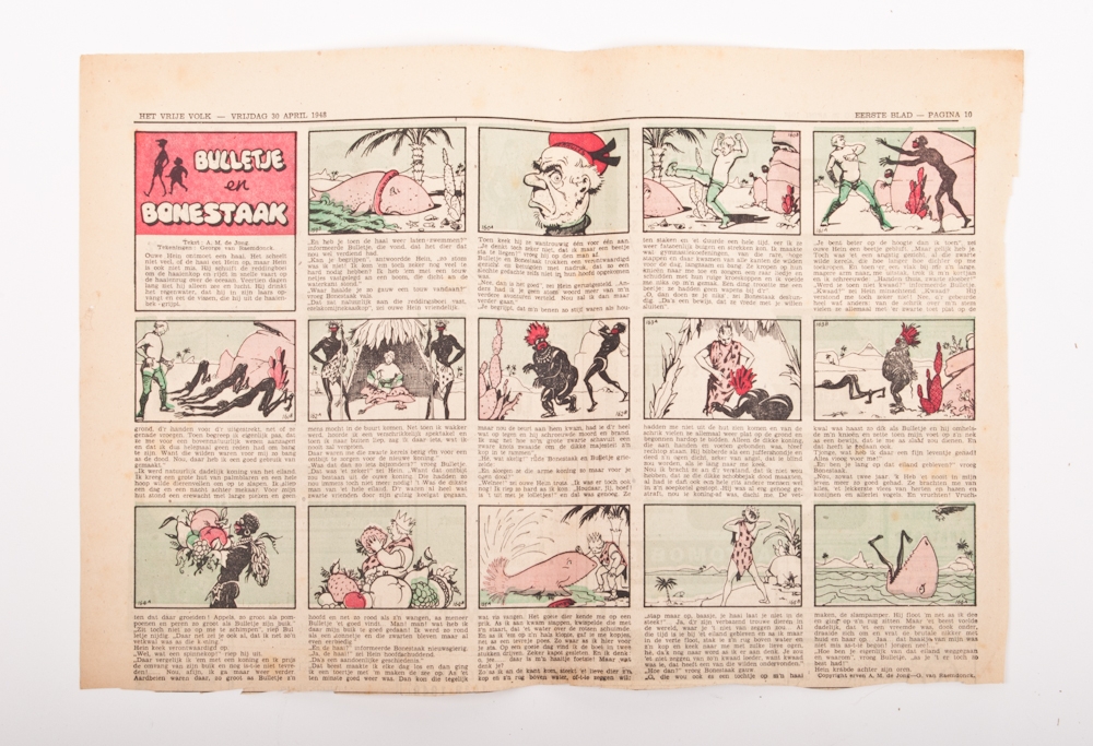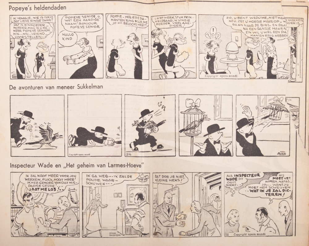 Newspaper comic, Avondblad, 1936-1938. Several hundreds of newspaper clippings. Partly with "Sukkelman" and "de Baas". Partly with Inspecteur Wad (Edgar Wallace) + Bulletje en Boonestaak, clippings 1-649 from "het Vrije Volk" 1947-1949, in rows of three, with supporting colour.