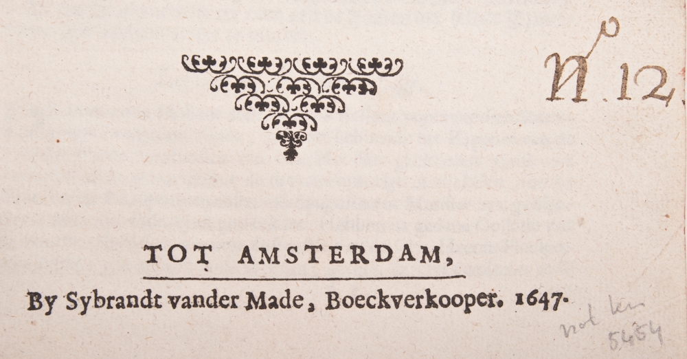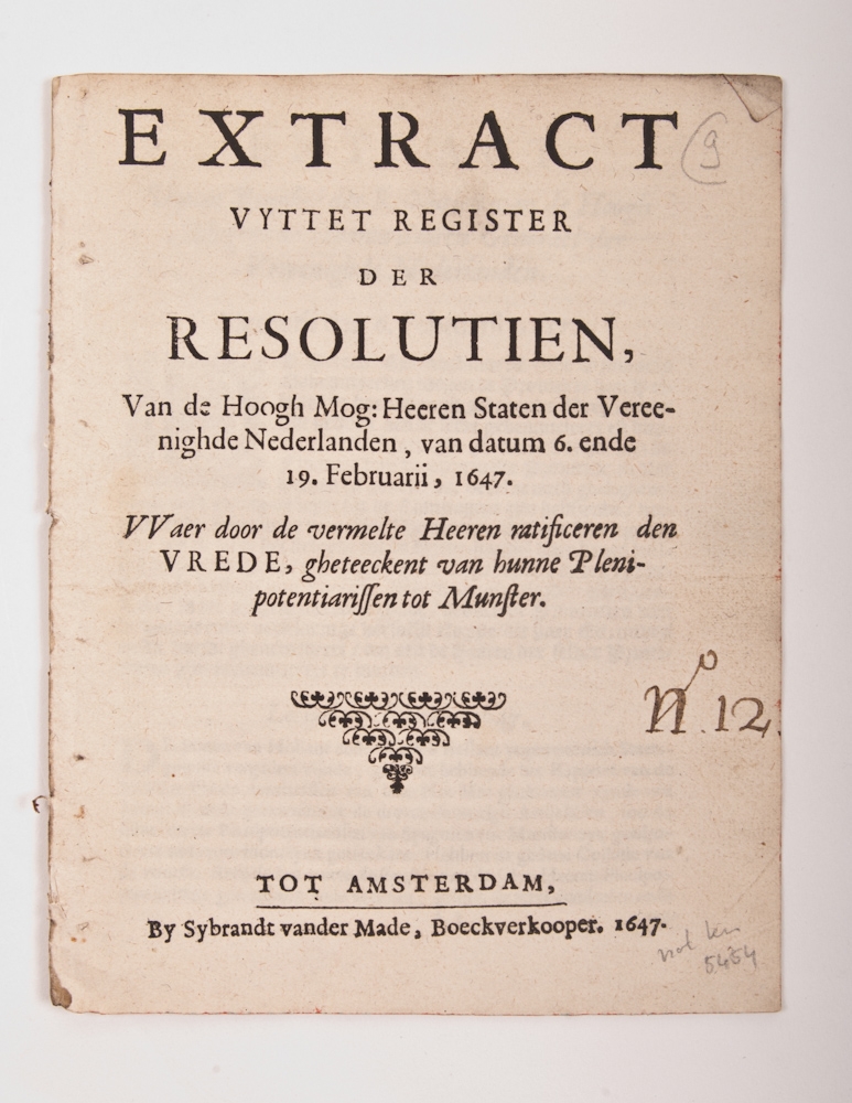 -Van de Hoogh. Mog: Heeren Staten der Vereenighde Nederlanden, van datum 6. ende 19. Februarii, 1647. VVaer de vermelte Heeren ratificeren den VREDE, gheteekent van hunne Plenipotentiarissen tot Munster. Tot Amsterdam, by Sybrandt vander Made, 1647.