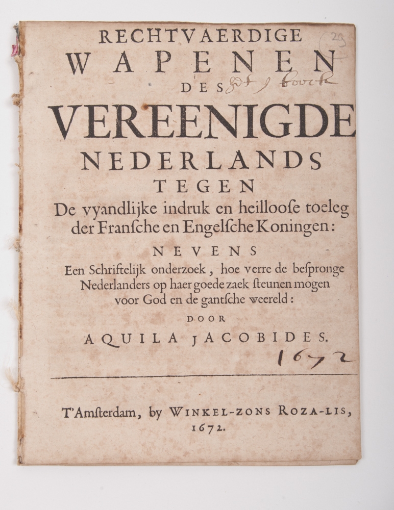 -tegen de vyandlijke indruk en heilloose toeleg der Fransche en Engelsche koningen....by Aquila Jacobides. T'Amsterdam, (published without alias) by Winkel-zons Roza-lis, 1672.