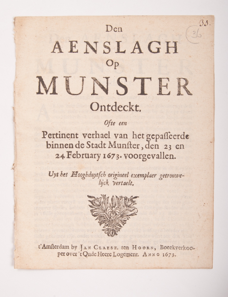 Den Aenslagh op Munster ontdeckt [...] getrouwelijck vertaelt uyt het Hooghduytsch. t'Amsterdam by Jan Claesz. ten Hoorn, 1673. (total 3)