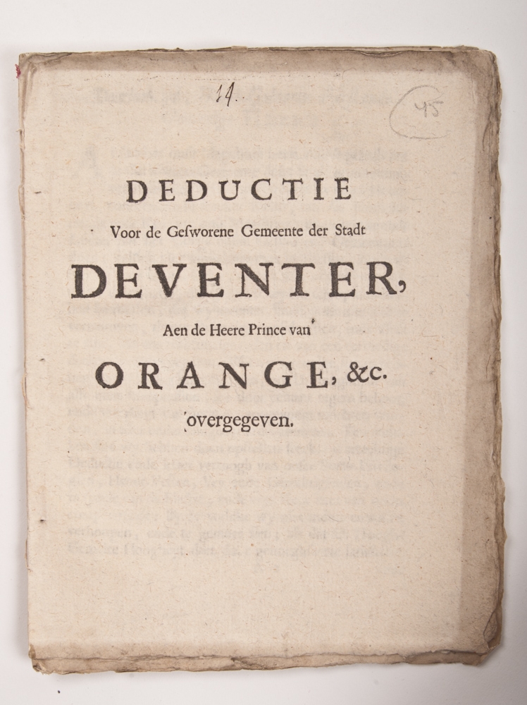 -van Vragen en Antwoorden [...]nevens de Uytspraeck van sijn Hoogheyt den Heere Prince van Orange [...] waer by gevoeght is de Deductie van 't gepasseerde met de Gemeenteluyden tot Deventer, tot Amsterdam, by Jan Claesz. ten Hoorn, 1677 composed with: Deductie voor de gesworene Gemeente der Stadt Deventer, aen de Heere Prince van Orange, &c. overgegeven. z.j. (1677) en pl. and: