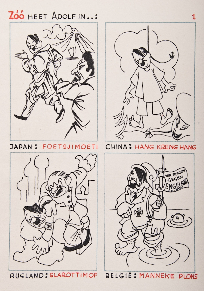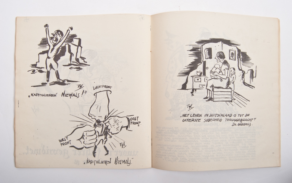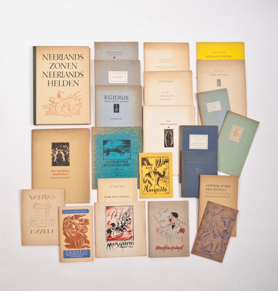 Several titles: (J.H. van Eikeren), Vier Maria Legenden (no place, publisher and year of publication); J. Geel, Gesprek op den Dachenfels (Amst., A.A. Balkema, (1944)); J. Engelman, Hart en Lied ((Den Haag), Final Stage Press, 1944); J. Engelman, In het verborgene gedrukt (Utr., v.h. J.G. Broese, 1945. Signed by author and publisher); Egidius waar bestu bleven (Amst., De Bezige Bij, 1945); Moffenspiegel. Een boekje over Adolf de Eerste (en de laatste) en zijn trawanten (Amst., De Bezige Bij, 1944) and F. Langen, Achter slot en grendel (Amst., De Bezige Bij, 1944).