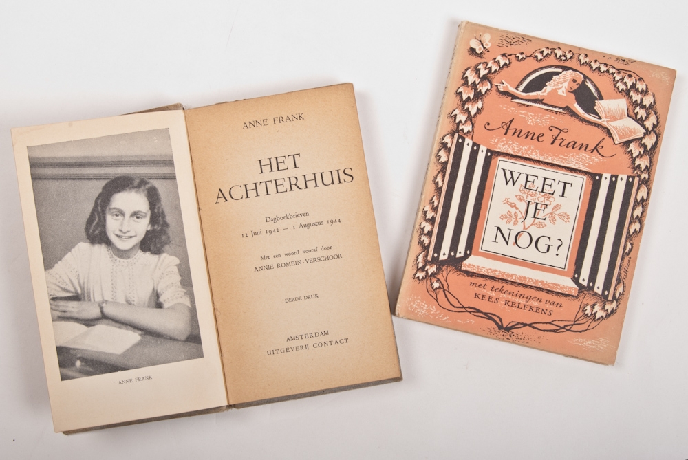 Het Achterhuis, Contact, Amsterdam, 1948, 3rd print, 1st edition, 253 p., bound. Sl. worn, fairly good copy. + Weet je nog? Contact, Amsterdam, 1949, 64 p., bound. Verhalen en sprookjes van Anne Frank, ill. by Kees Kelfkens. Good copy. Both without s.o.