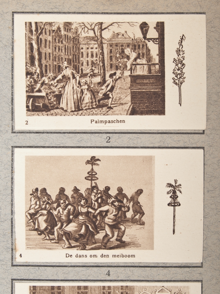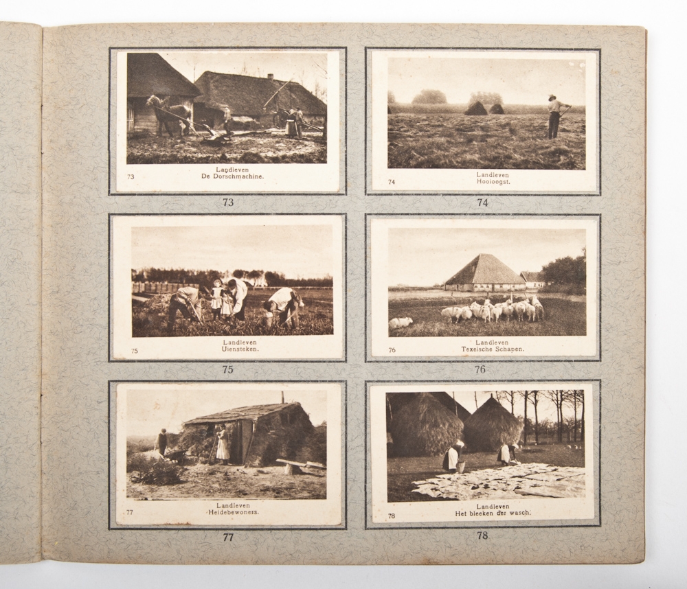 Amsterdam 1928. Complete with 80 pictures of the 'maatschappelijk leven onzer voorouders'. Name of the owner is written by hand on the first page (Jacabo H. de Roos). Stapled edition, in good condition. + Firma Simon Gaastra Stoomkoffiebranderij - Theehandel Workum. Album Ons Eigen Land en Volk. Amsterdam, 1926. Complete with 80 pictures. Stapled edition with sl. visible fold on front and back, otherwise good copy.