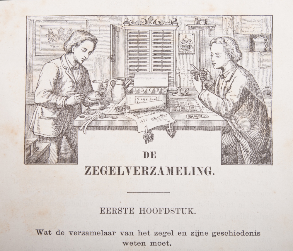 'Handboek voor het aanleggen van eene zegelverzameling' has some rust stains on first few pages (total 11).