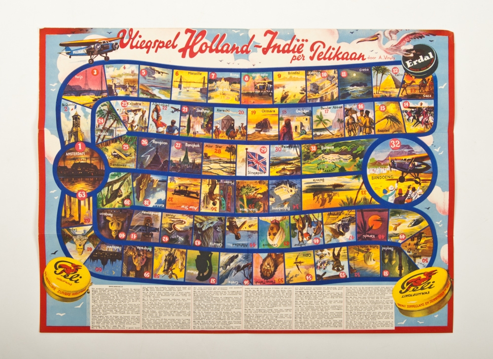 De uitreis Amsterdam-Batavia van de Pelikaan. Jac. Rykse, Bliscofabrieken Helmond, 1933. Cloth designed for the occasion + advertisement Vliegspel Holland-Indië per Pelikaan door A. Viruly, uitgave Erdal fabriek Amsterdam.