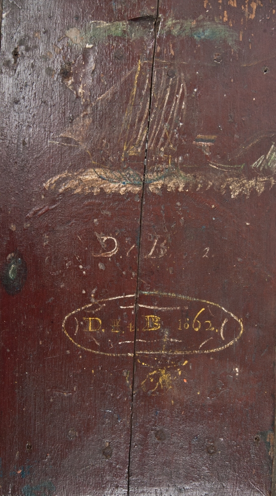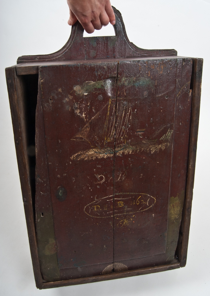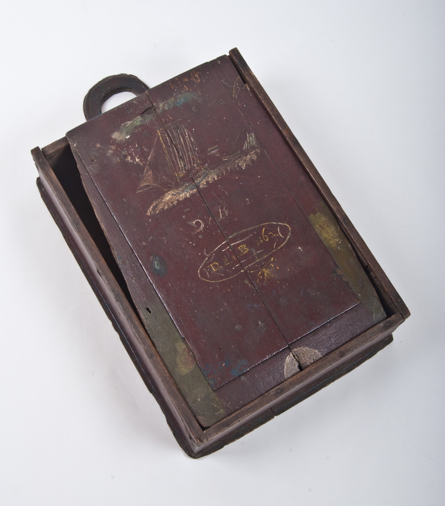 Wooden school bag. 47 x 34 x 14 cm. Small chip missing from plate upper left corner, otherwise intact item.