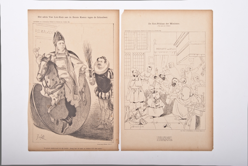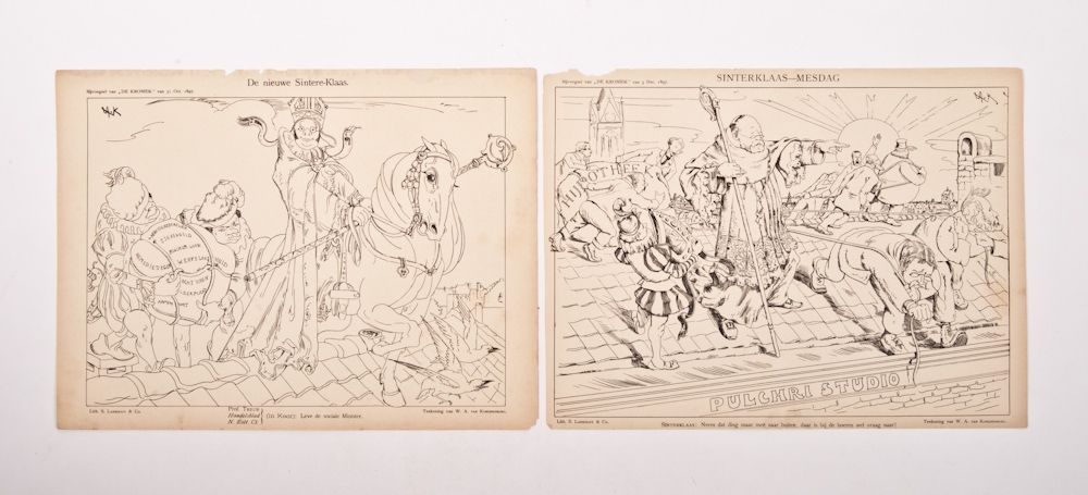 Johan Braakensiek (1858-1940) Appendix to: De Amsterdammer, Weekblad voor Nederland van 2 December, 1888. Ellerman, Harms & Co, Amsterdam. 29 x 44 cm in passepartout. + 2 others - and 2 appendices to "de Kroniek", 1897. W.A. van Konijnenburg, lith. Lankhout & Co.