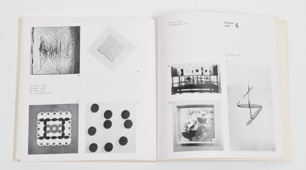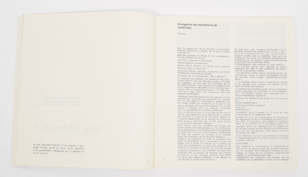 Propositions visuelles du mouvement international Nouvelle Tendance. Musee des Arts Decoratifs, Paris, 1964. Edited by Michel Fare and Karl Gerstner. 16 x 16 cm, 105 pp. Artists and collectives included Demarco, Richter, Riley, Uecker, Equipo 57, Groupe de Recherche d'art Visuele, Groupe T and Groupe N. among others. Text in French. + Nova tendencija 3, Galerija suvremene umjetnosti, Zagreb, 1965. 20 x 21 cm, 180 pp. Rare document of a large international group exhibition in Zagreb in 1965. Featuring Gerstner, Von Graevenitz, Mestrovic, Morellet, Munari, De Vries, Rot, Peeters, Ricerca Cibernetica Gruppo, Equipo 57 and others. Text in French, Italian, German, English, Russian and Yugoslavian. + 14 pages with stencilled program information about Nova tendencija 4, dated November 1968.