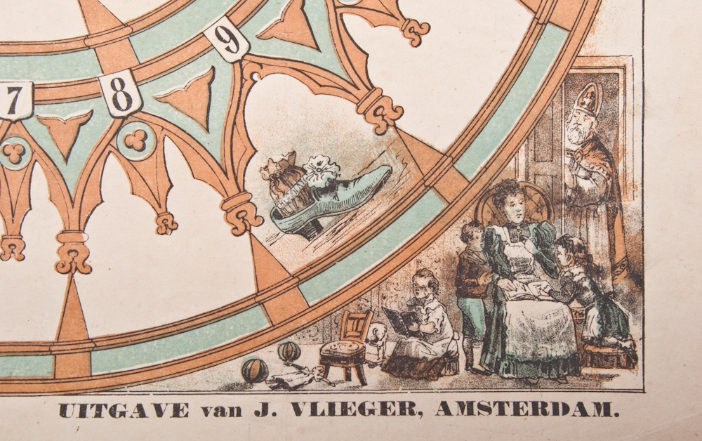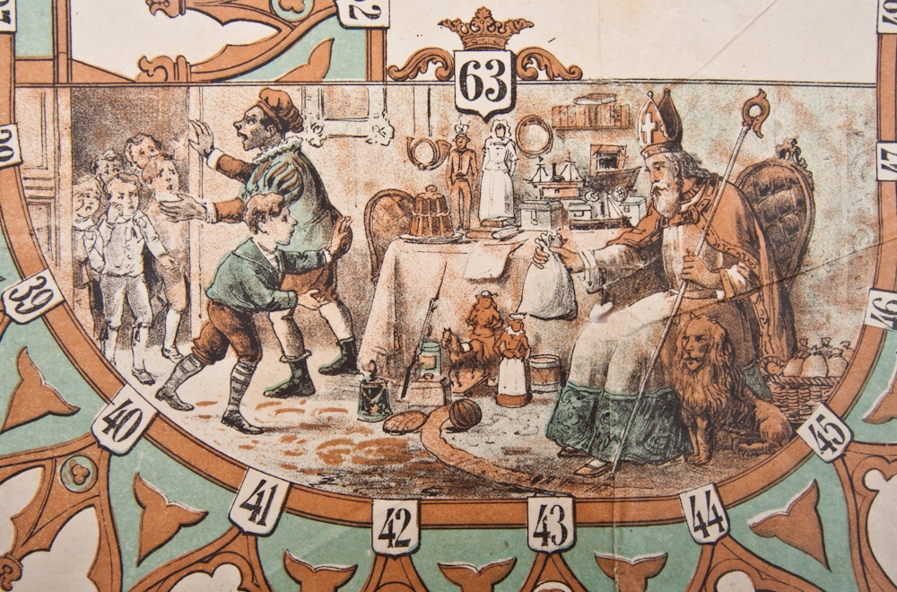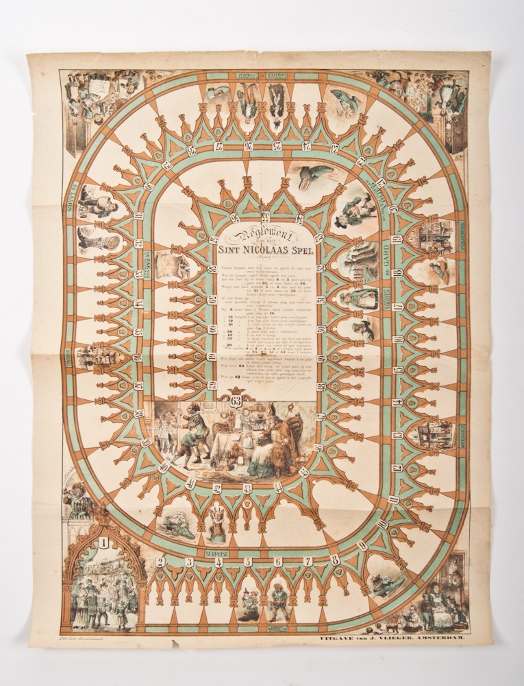 Lith. Gebr. Braakensiek, J. Vlieger Amsterdam, ca. 1888. Game of the goose-like game with game rules written in the centre. Has been folded. 60 x 46 cm.
