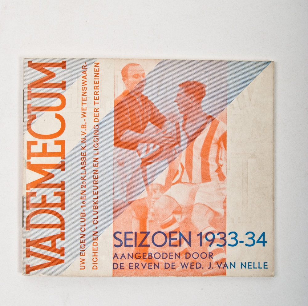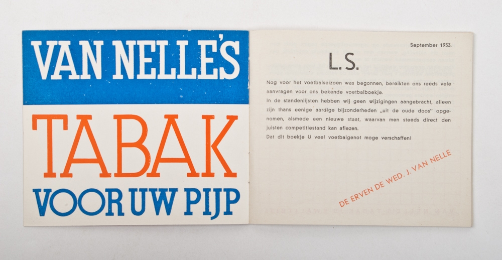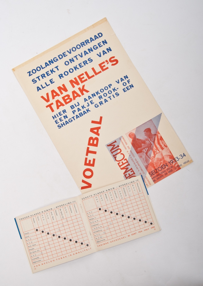 Poster for the football booklet of season 1933-34 which Jongert designed for van Nelle. Text: Zoolang de voorraad strekt ontvangen alle rookers van van Nelle's Tabak hier bij aankoop van een pakje rook- of shagtabak gratis een Voetbal Vademecum. 34,5 x 22 cm. + accompanying booklet.